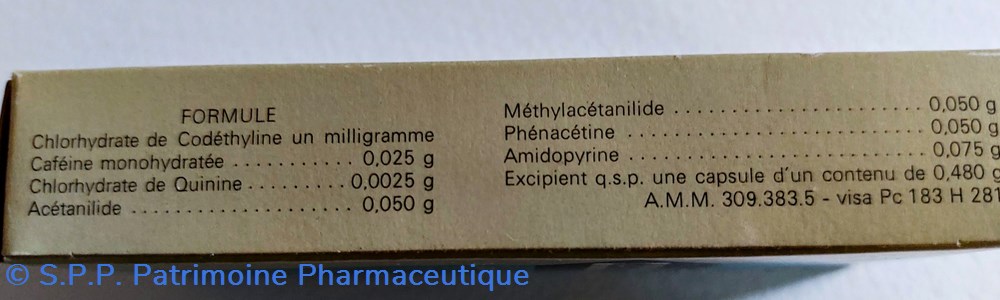 Formule : Clorhydrate de Codethyline, Caféine monohydratée, Chlorhydrate de Quinine, de Acetanilide. Methylacetanilide Phenaceine Amidopyrine