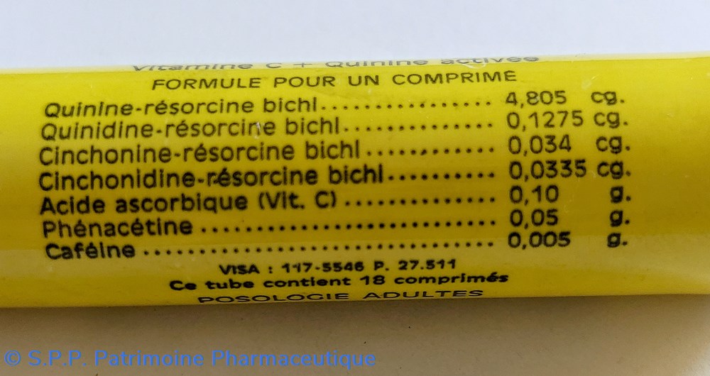 Formule : Quinine résorcine Quinidine résorcine Cinchonine résorcine Cinchonidine résorcine Acide ascorbique Phénacétine Caféine.