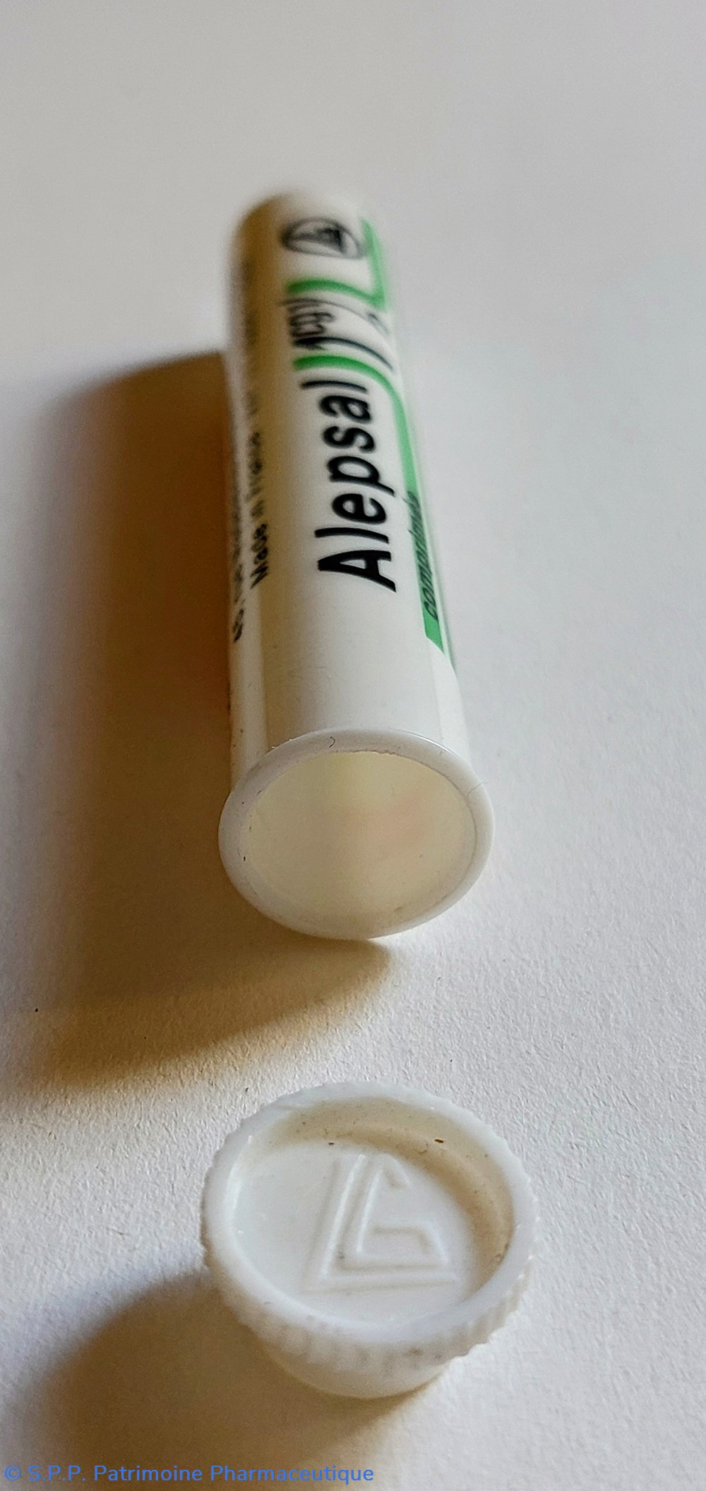 Tube en plastique longueur 7 cm Diamètre 1.3 cm ayant contenu des comprimés ALEPSAL 1 cg 1/2