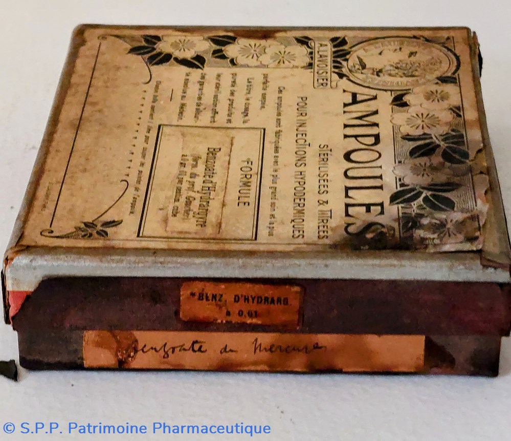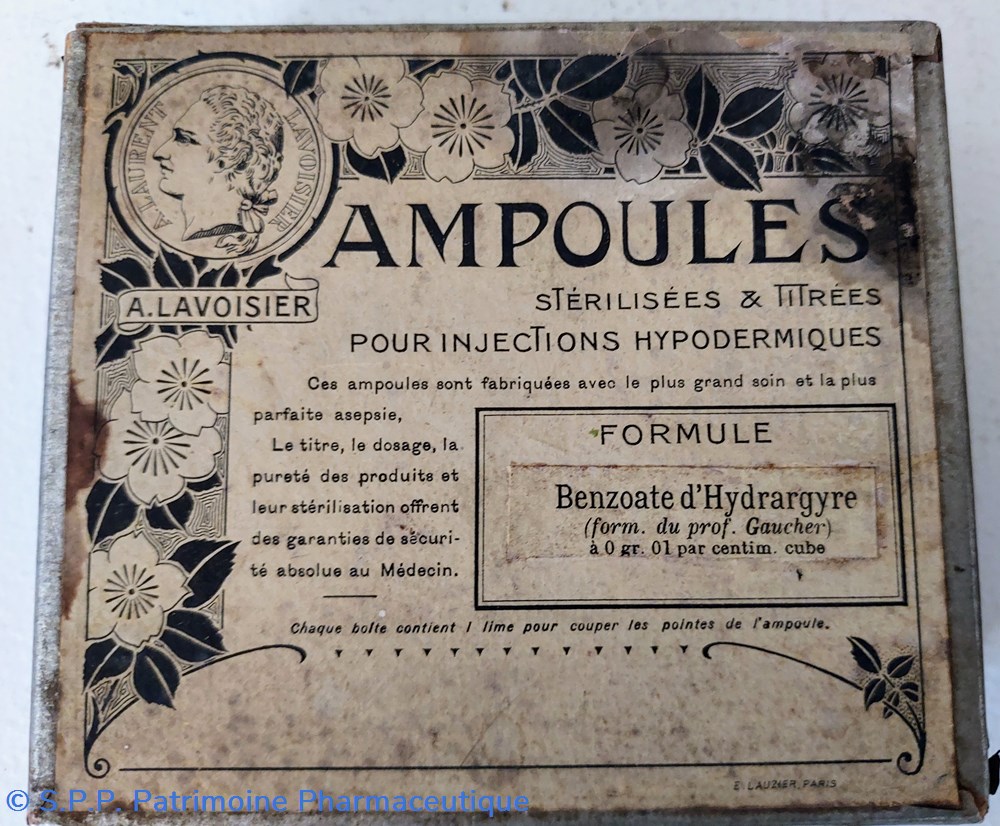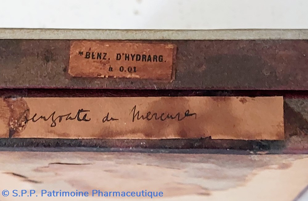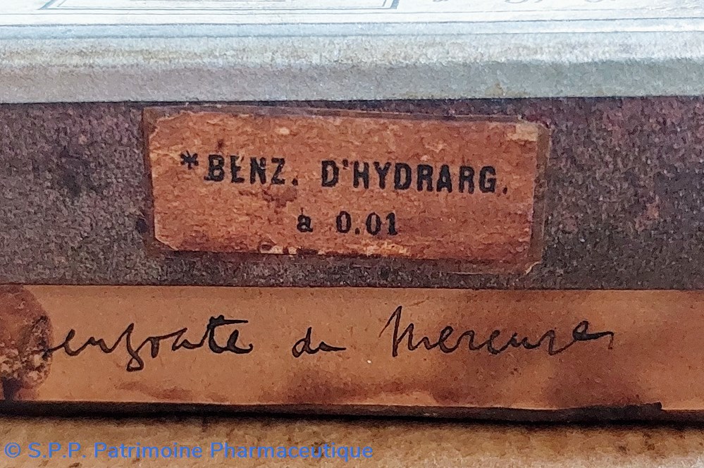 Une étiquette manuscrite indique " Benzoate de MERCURE"