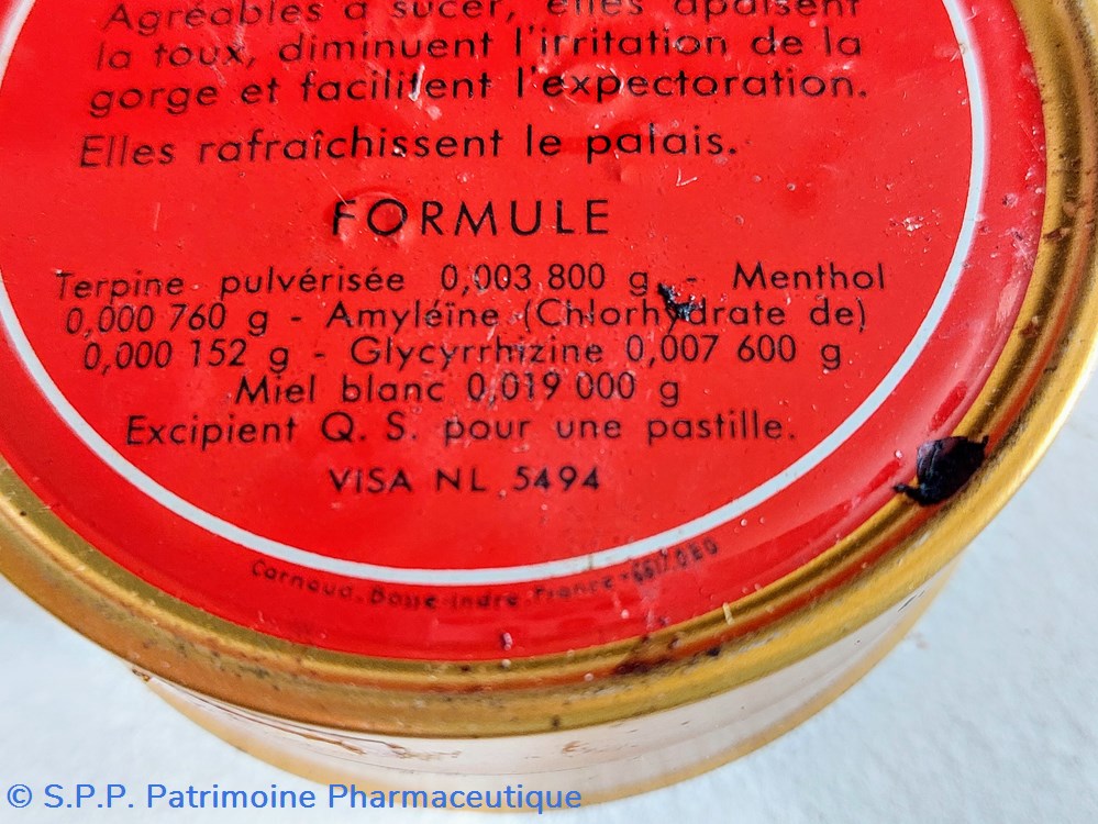 Formule Terpine pulvérisée Menthol Chte de diméthylamino dimethyl ethylcarbinol, Glycyrrhizine Miel blanc.