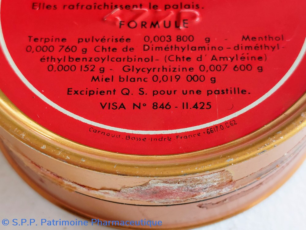 Contient Terpine pulvérisée, Menthol Amyleine, ( chlorhydrate de) Glycyrrhizine Miel blanc.