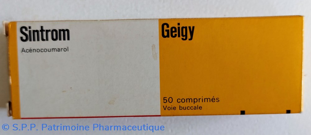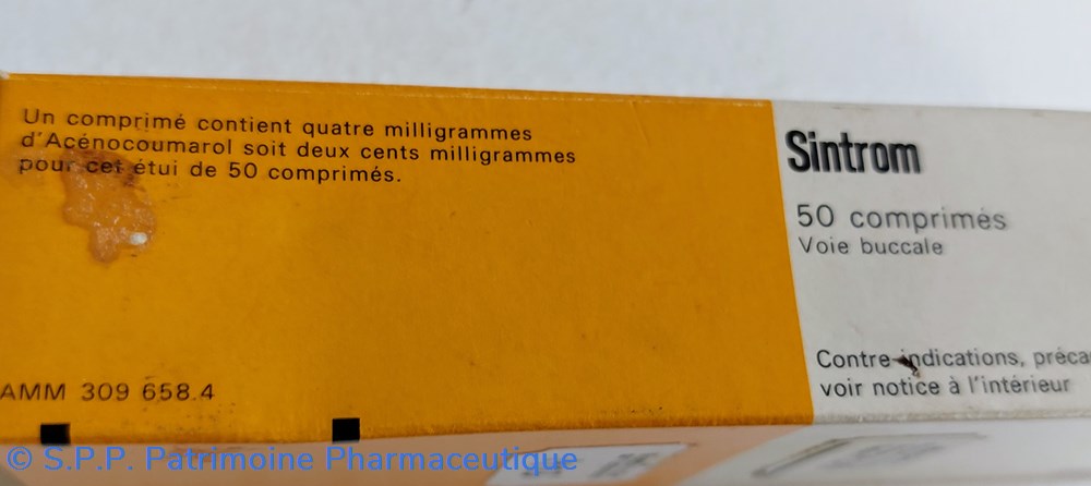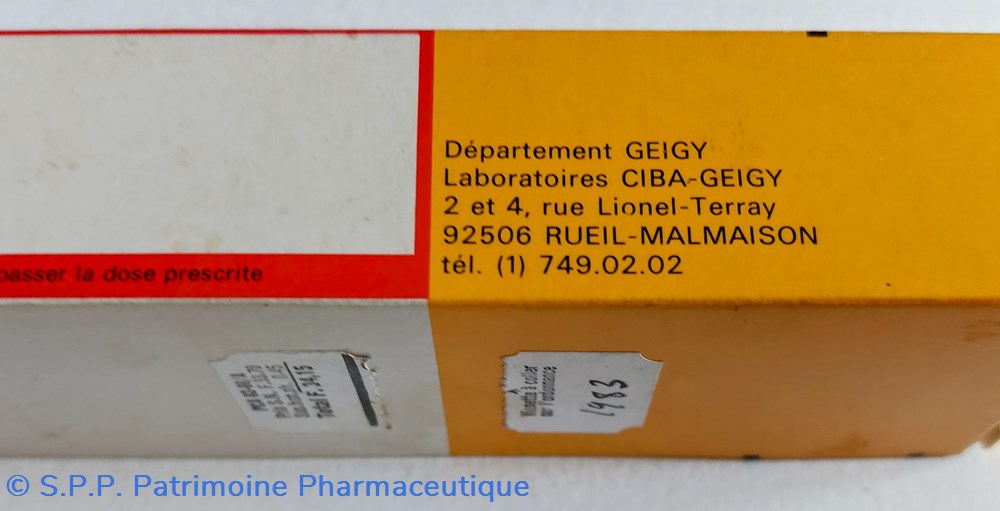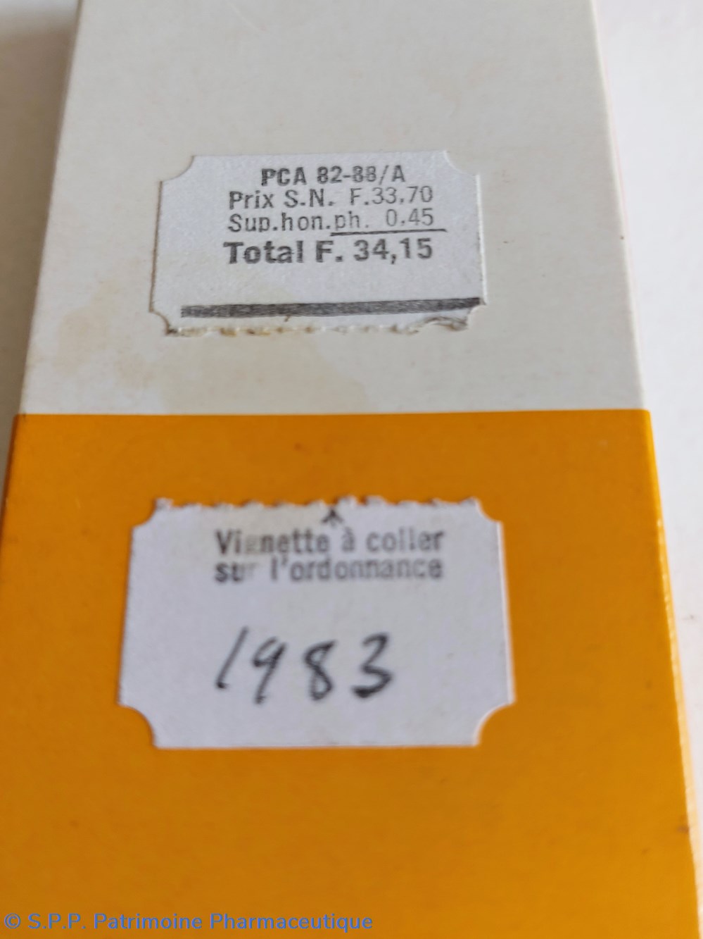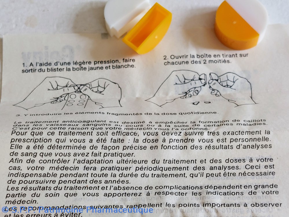 Boîte carton13, 5 * 4,5 * 3 cm vide des 50 comprimés contenant deux mini contenants bicolores blancs et jaunes. Ces petits conditionnements servaient à y incorporer la dose quotidienne de traitement.