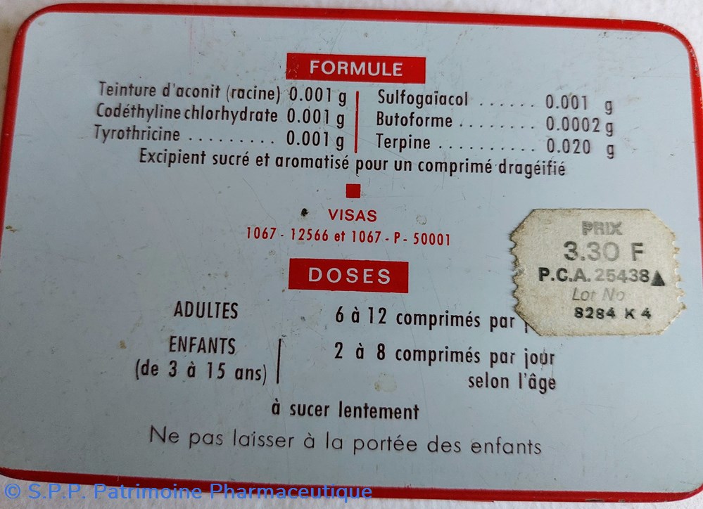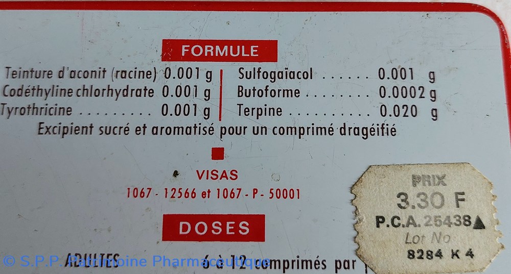 Formule :Teinture d'Aconit, Codéthyline chlorhydrate, Tyrothricine, Sulfogaïacol, Butoforme, Terpine.