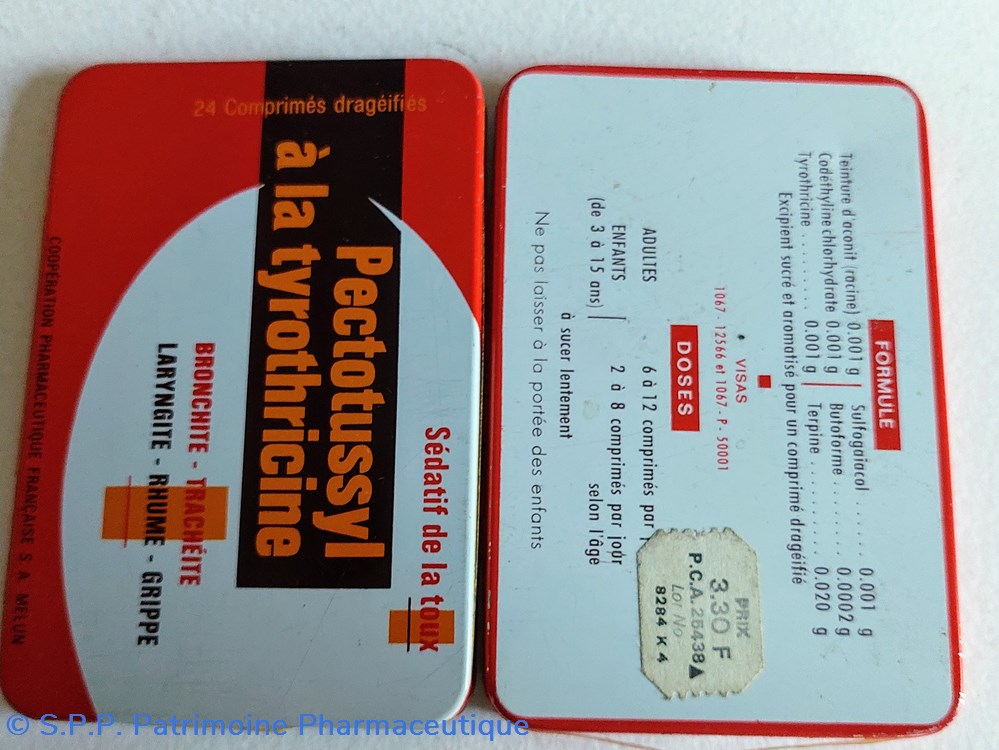 Boite métallique vide en bon état 10.5 * 7 * 1.2 cm ayant contenu 24 comprimés dragéifiés PECTOTUSSYL à la TYROTHRICINE .