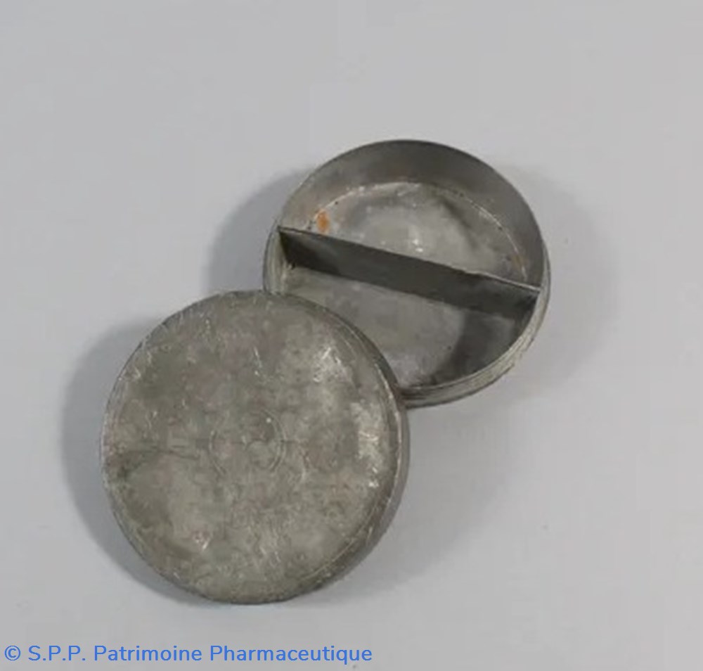 Boîte à onguent en étain à double compartiments. Couvercle à vis. Il y a une mention au crayon ; "Augier". En effet cet objet a appartenu au Général AUGIER Jean=Baptiste. Il a été vendu aux enchères lors d'une vente de souvenirs faite par la famille.