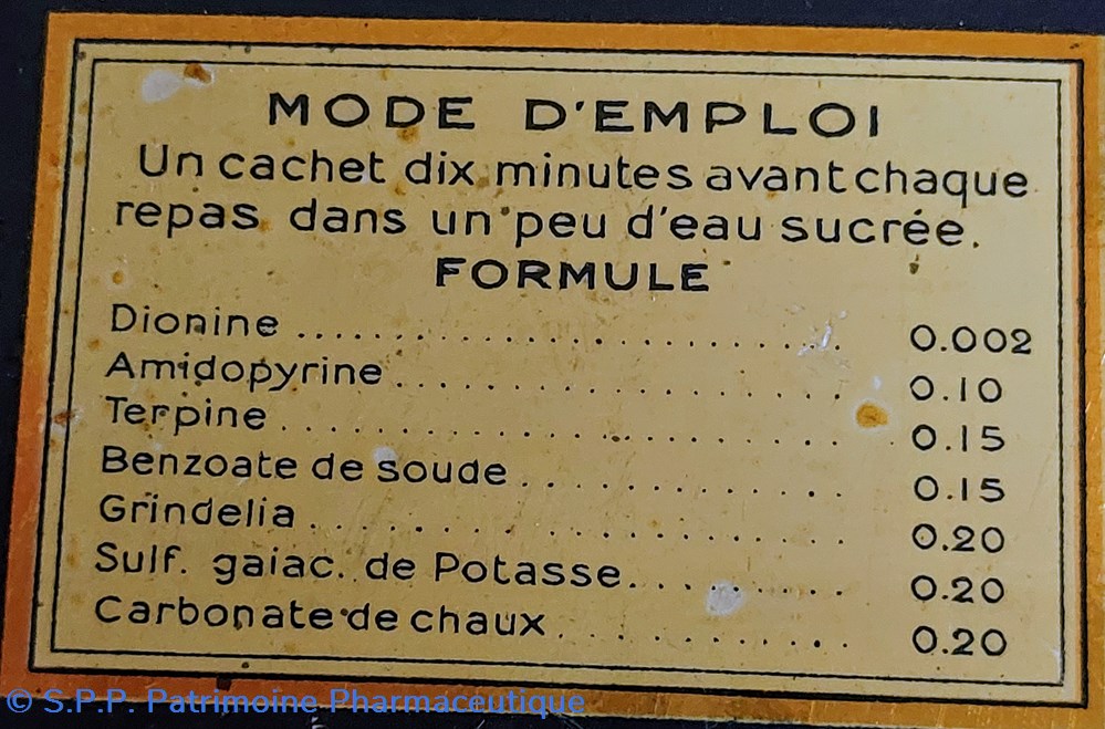 Formule : Dionine, l'amidopyrine, Terpine benzoate de Soude, Grindelia, Sulfate galac. de potasse et Carbonate de chaux.