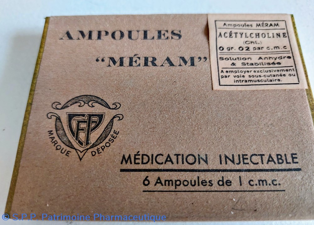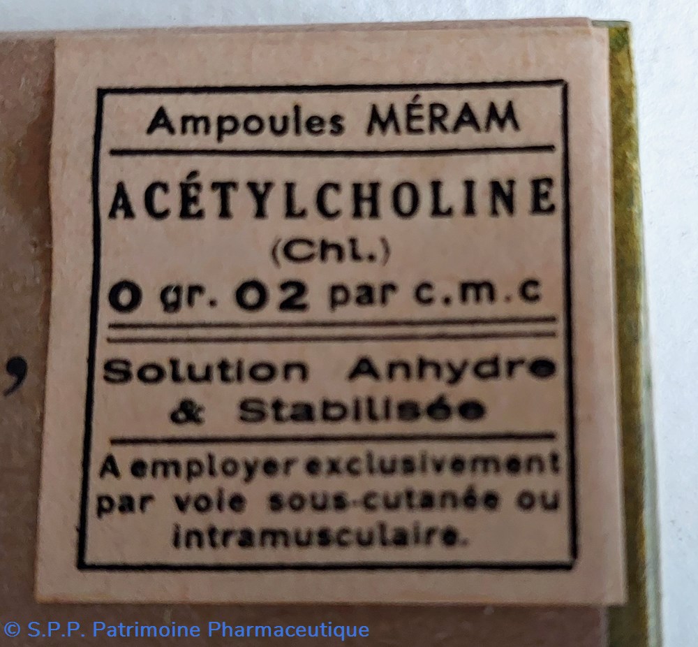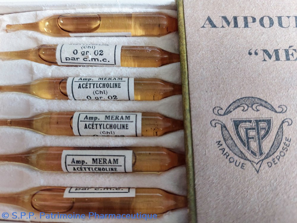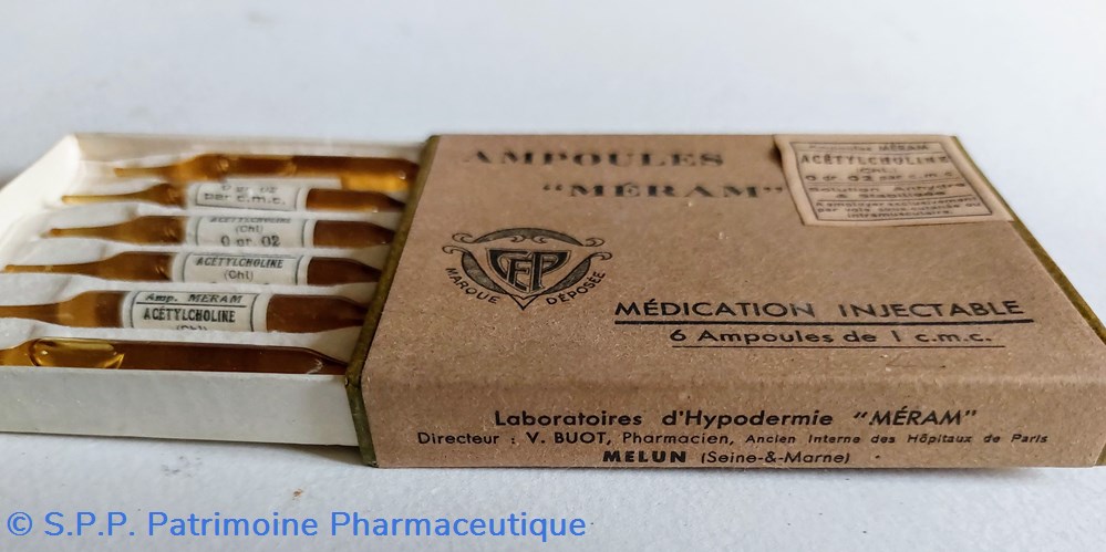 Coffret à tiroir en carton contenant 6 AMPOULES MERAM d'Acétylcholine 0.gr02 de 1 c. m. c.