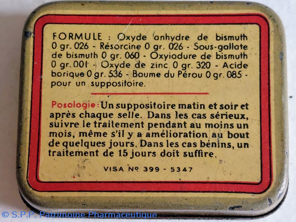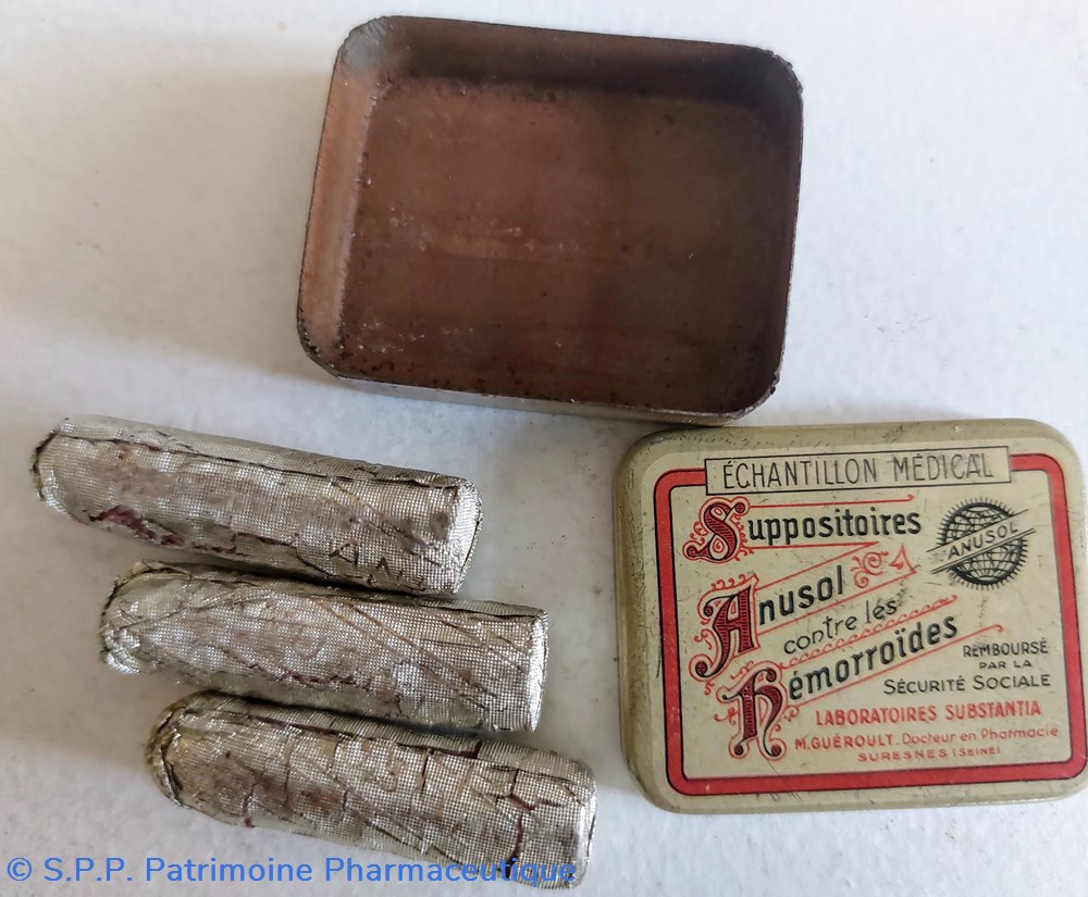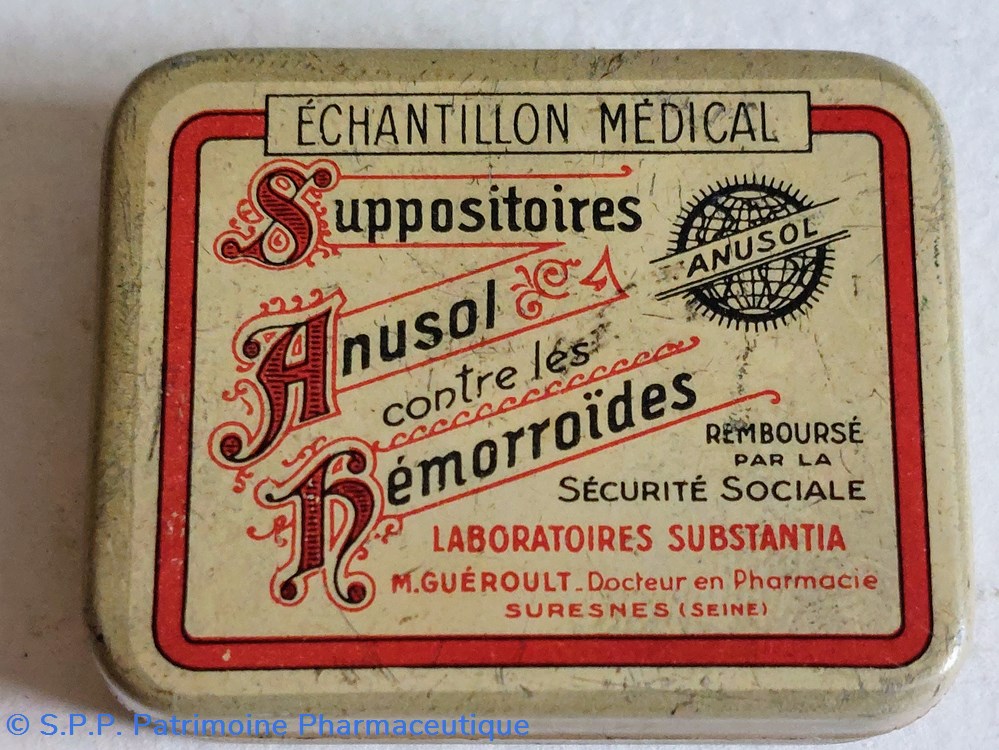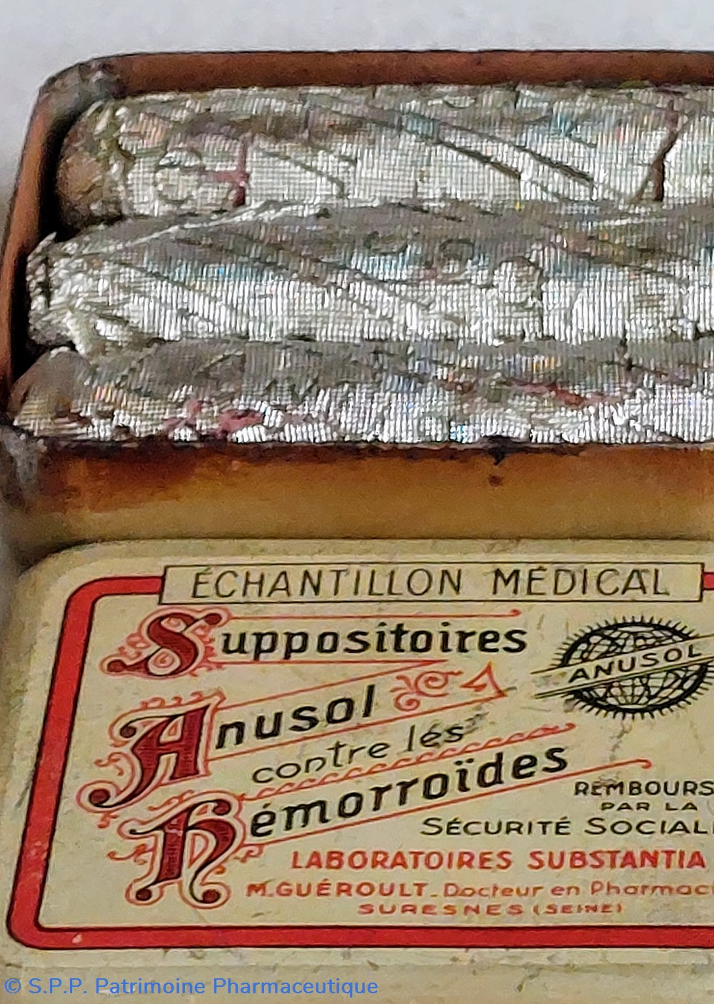Très petite boîte métallique de poche 4*3*1,2 cm ayant contenu - Échantillon médical de SUPPOSITOIRES ANUSOL contre les HÉMORROÏDES.