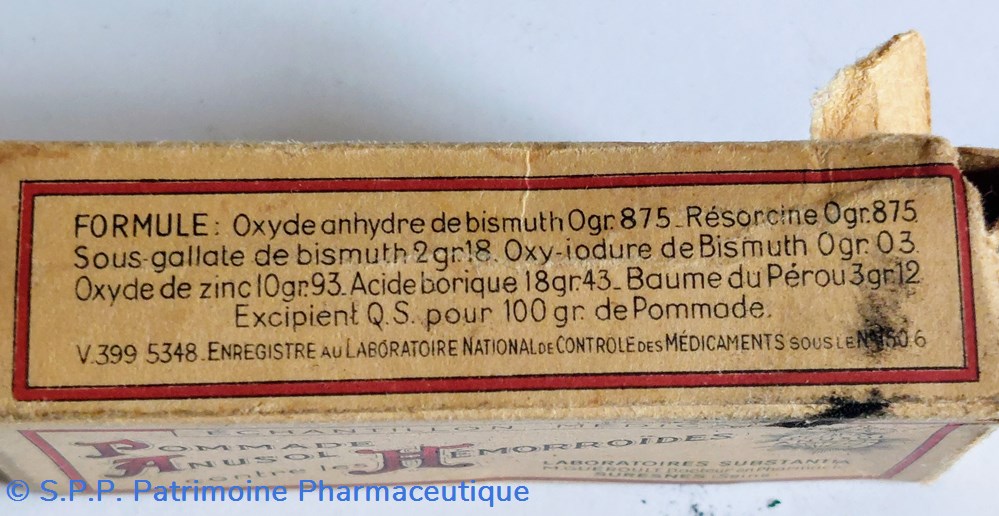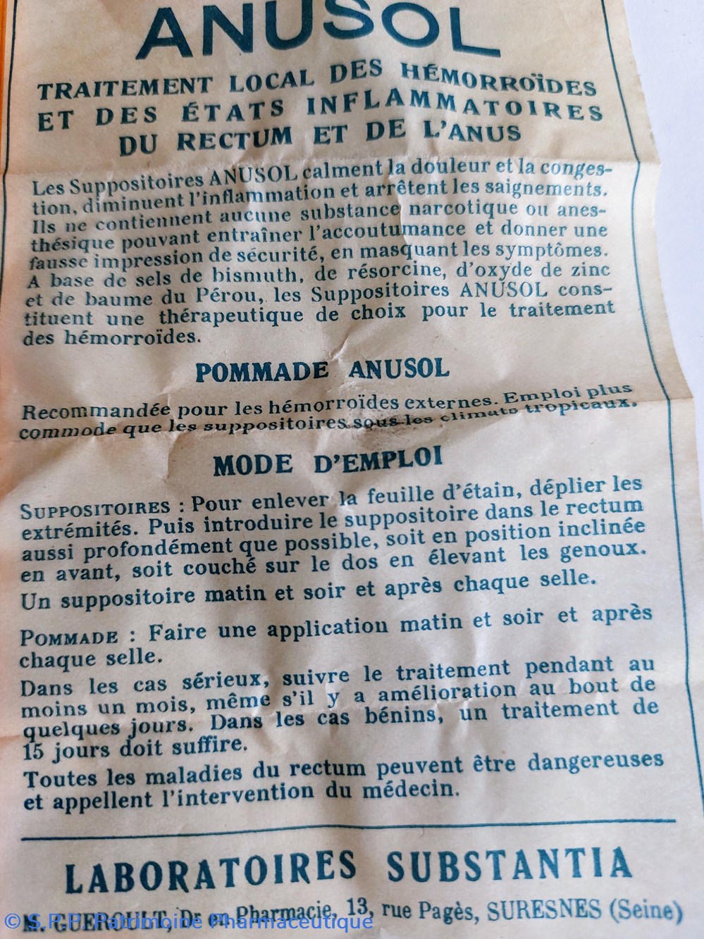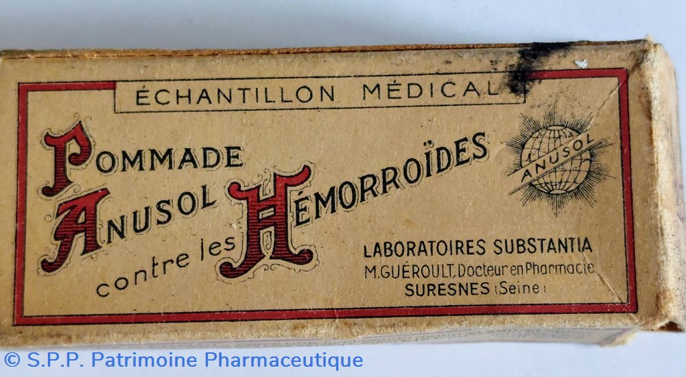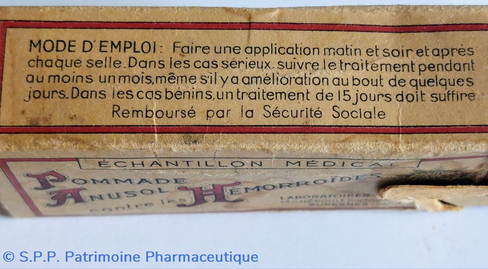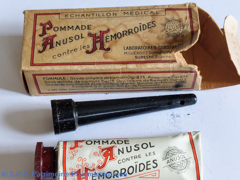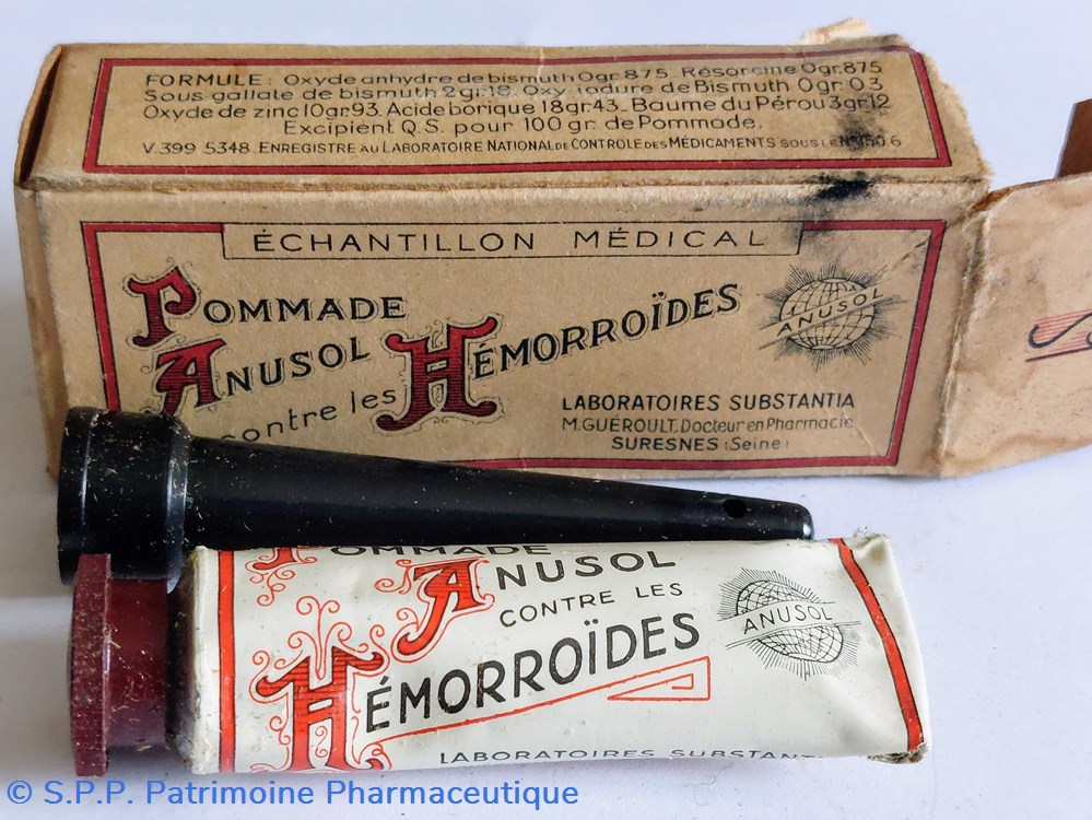 Petit Tube de POMMADE ANUSOL contre les HÉMORROÏDES et sa canule sous pochette en carton 7,5*3*2 cm.