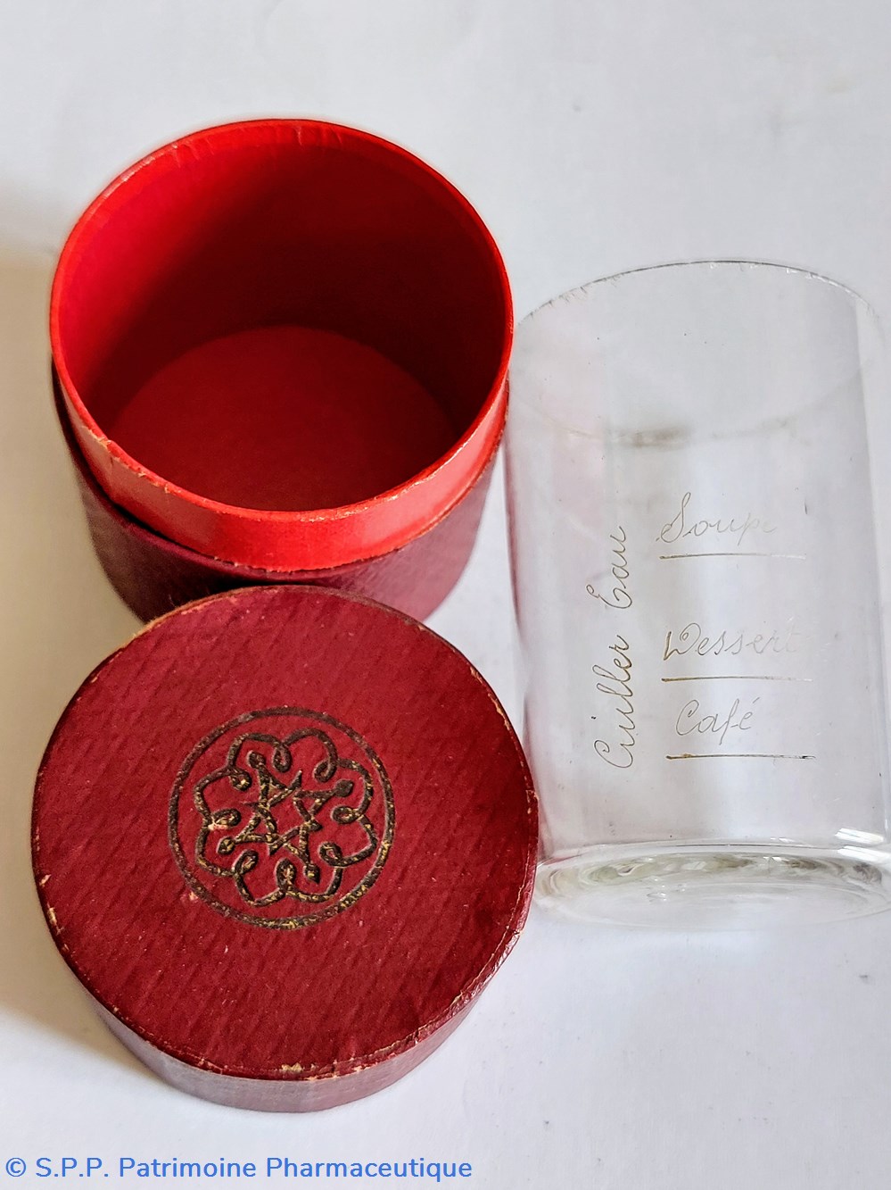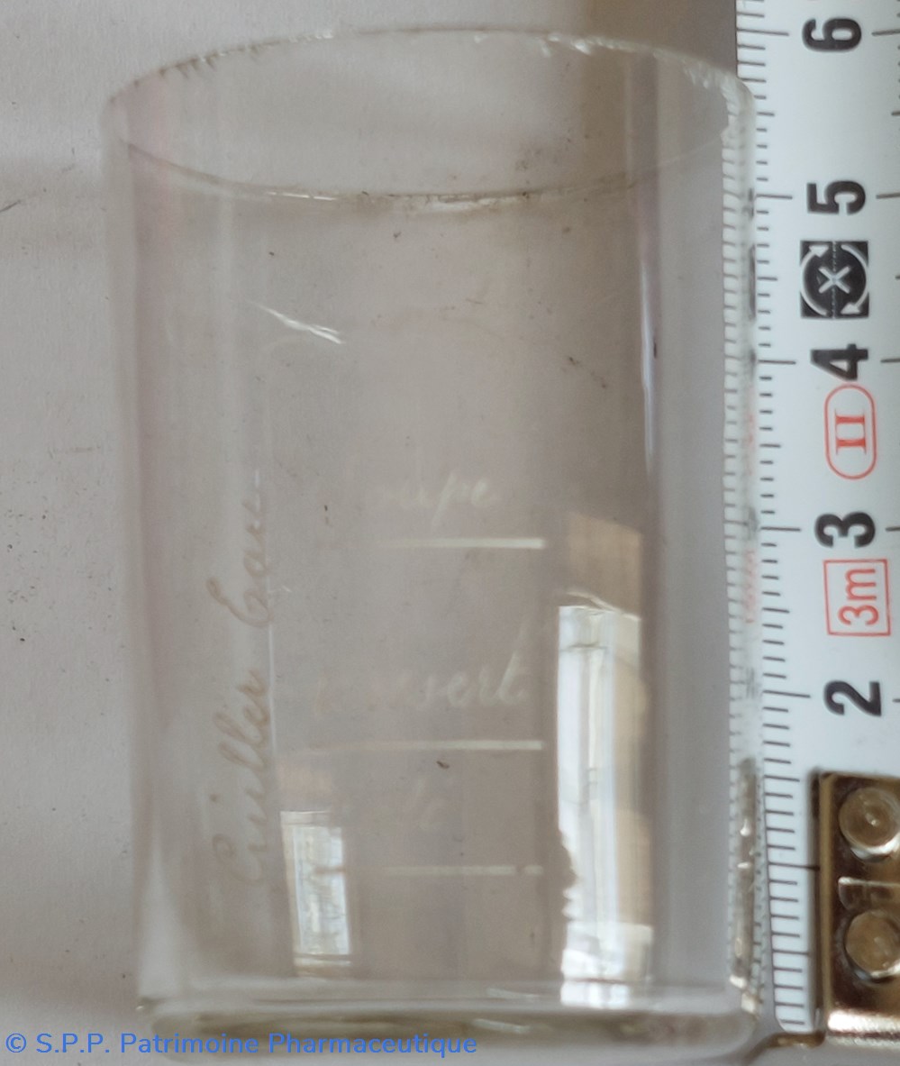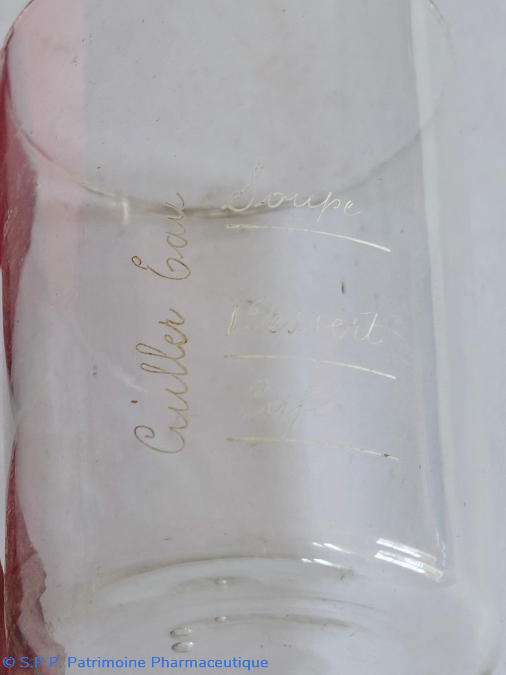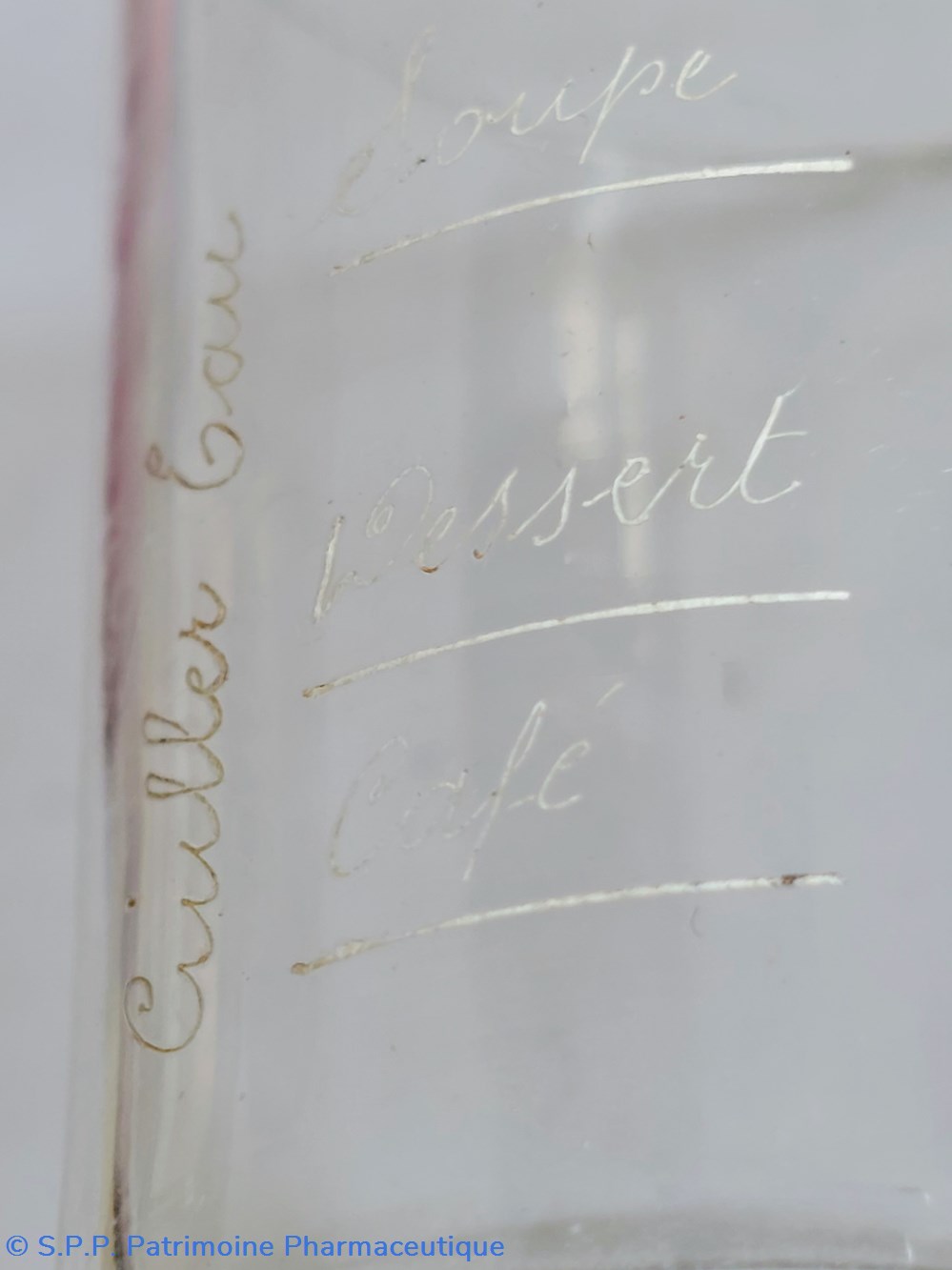 DOSEUR en verre fin MARQUÉ en vertical " CUILLER EAU* et en horizontal de bas en haut" Café Dessert Soupe "