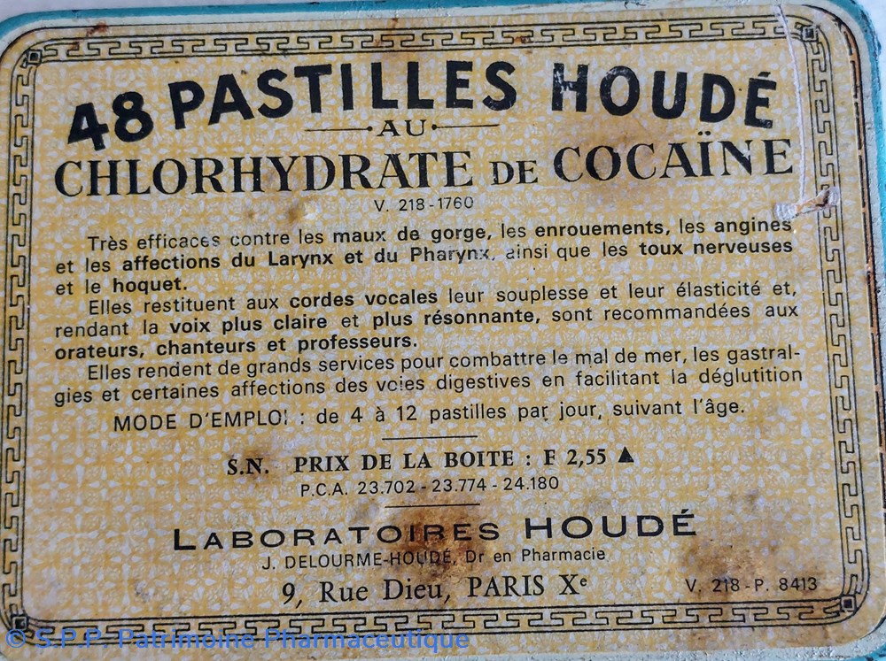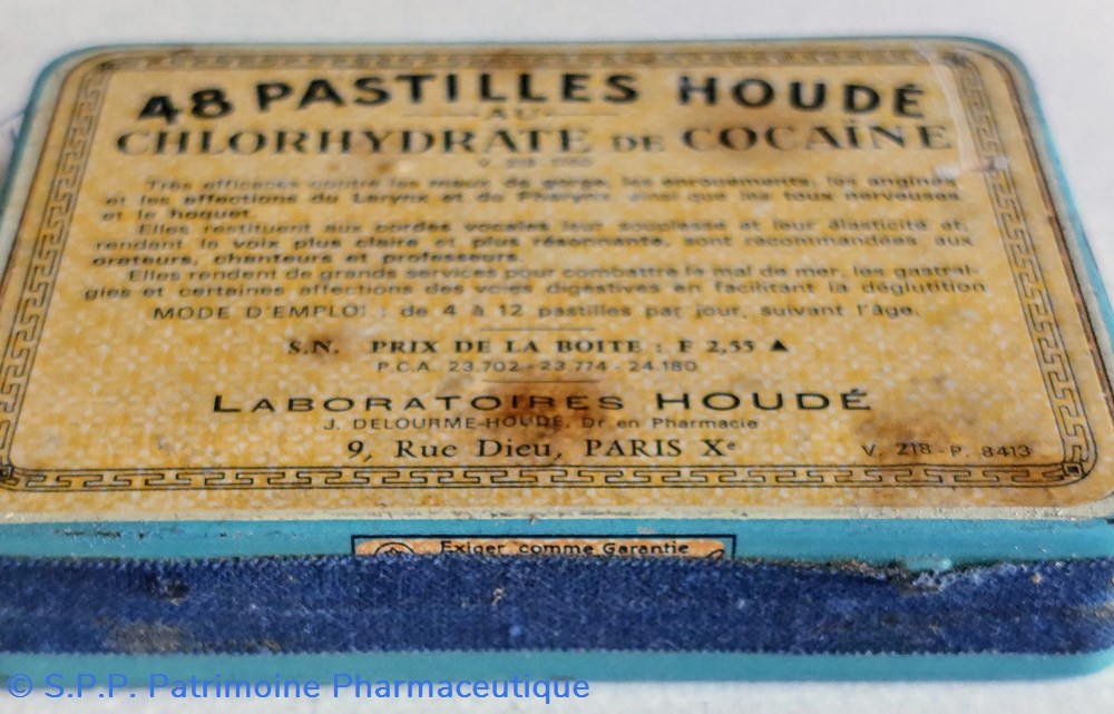 Boîte métallique scellée d'origine 8,7*6,7 1,8 cm complète contenant 48 PASTILLES HOUDÉ au CHLORHYDRATE de COCAÏNE.