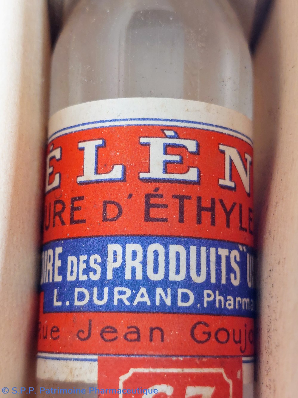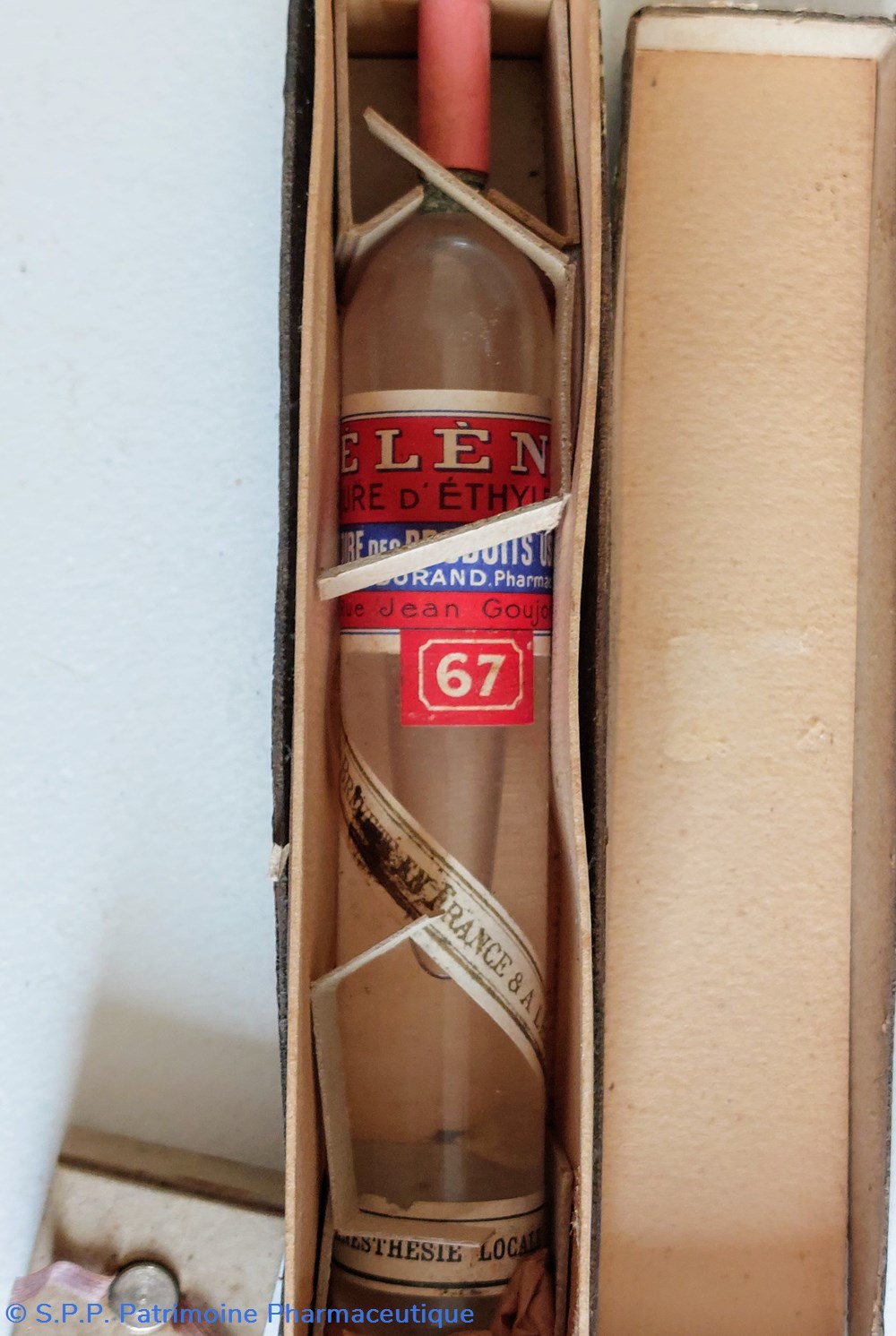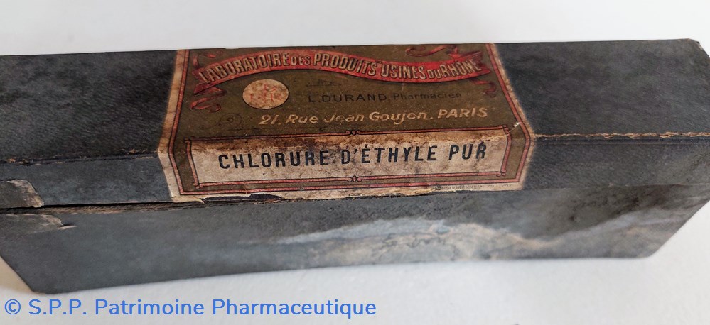 Boîte coffret en carton contenant une grosse ampoule non utilisée de CHLORURE D'ÉTHYLE PUR. Longue de 18 cm bloquée dans son emballage.