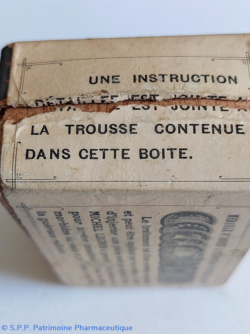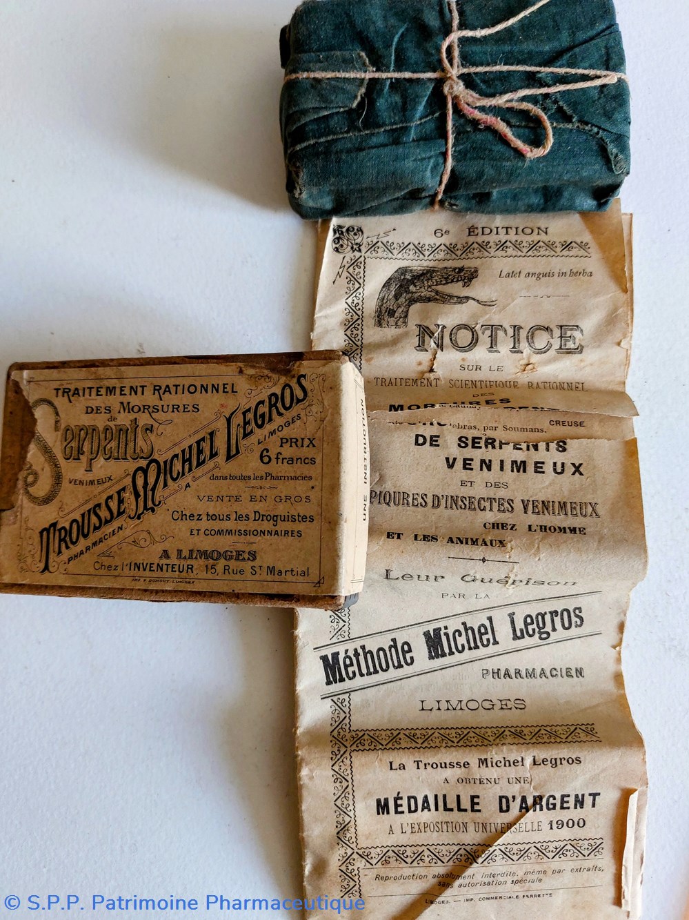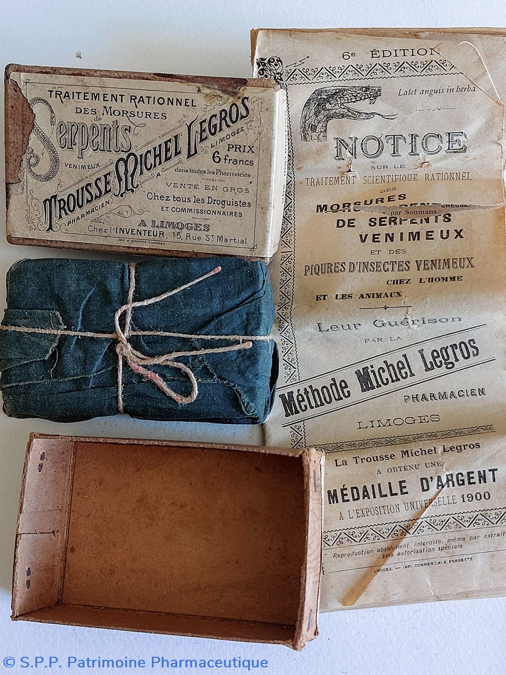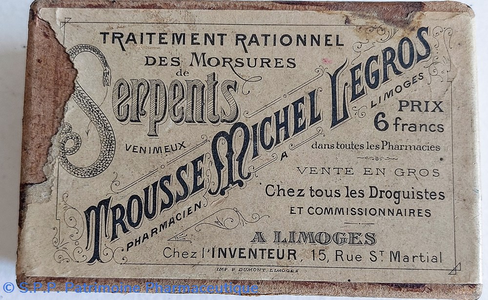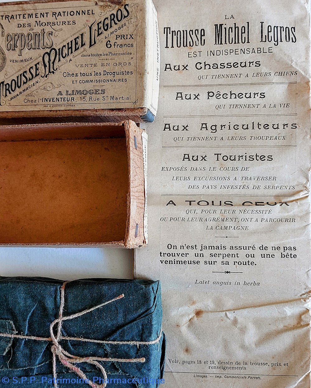 Boîte en carton contenant un nécessaire d'intervention contre les MORSURES de Serpents " TROUSSE MICHEL LEGROS" Limoges. ( paquet ficelé d'origine)