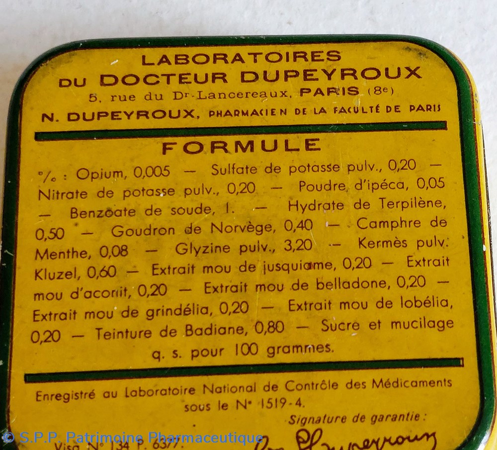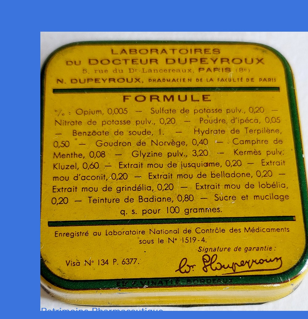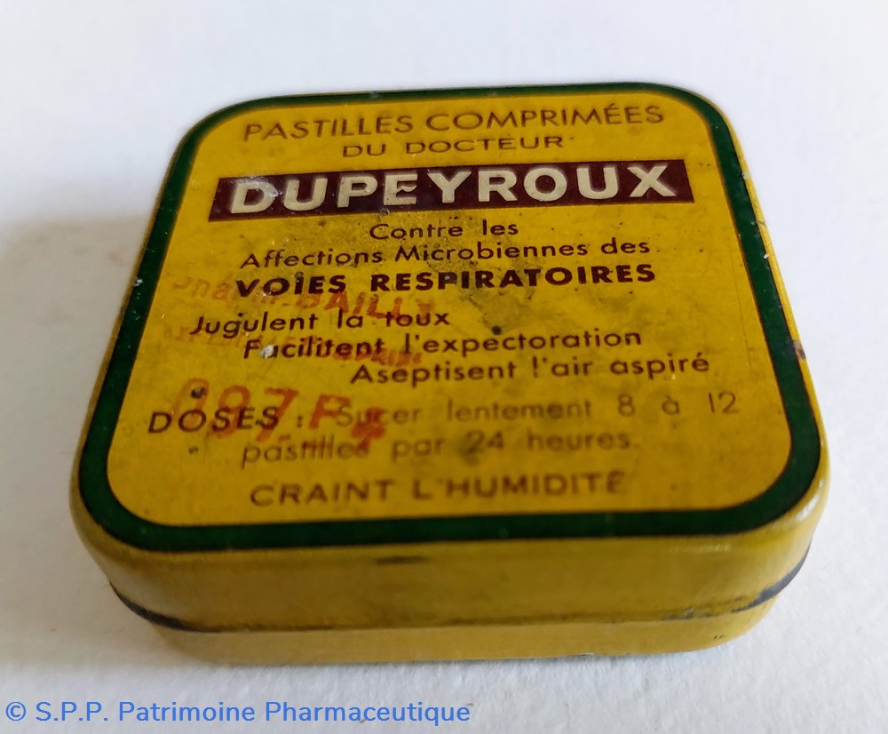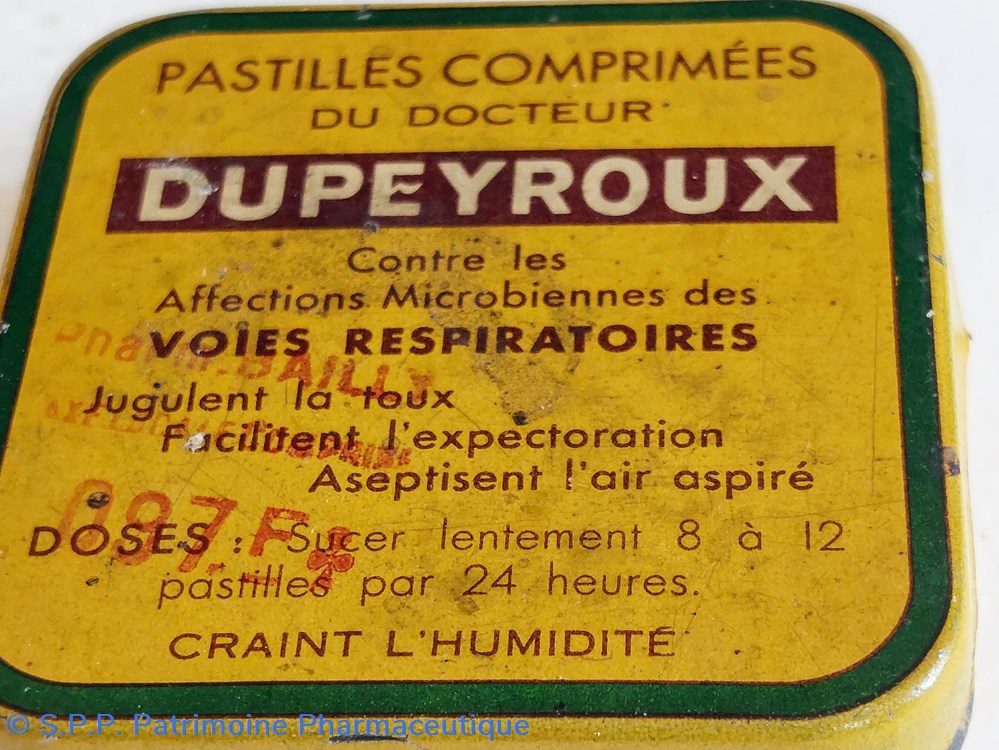 Boîte ayant contenu des PASTILLES COMPRIMÉES du Docteur DUPEYROUX contre les affections microbiennes des voies respiratoires