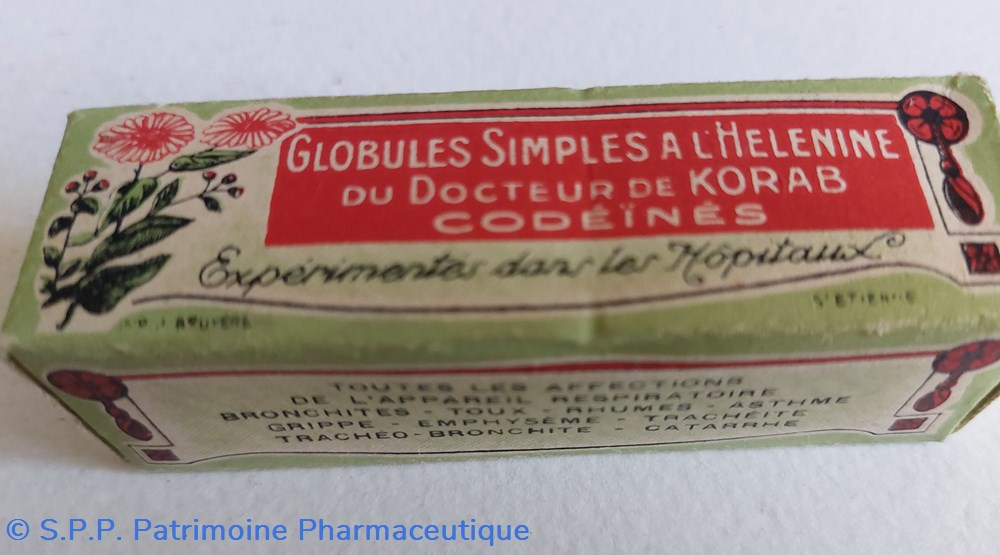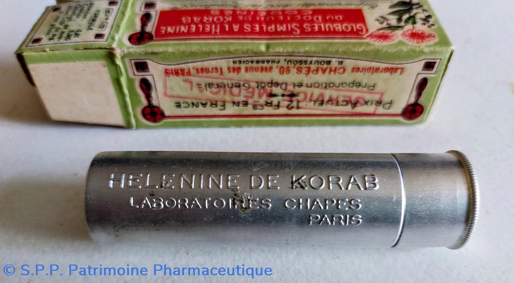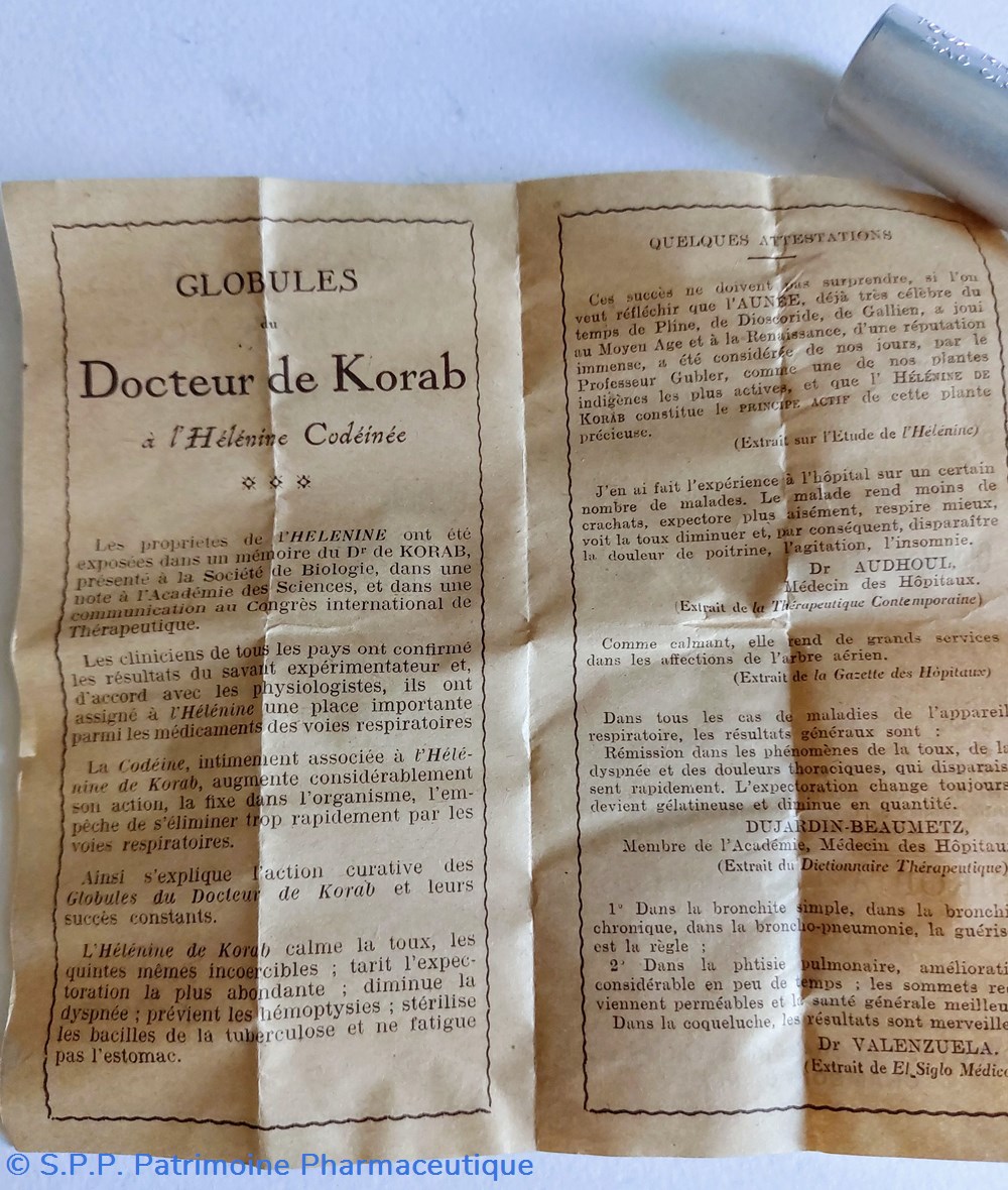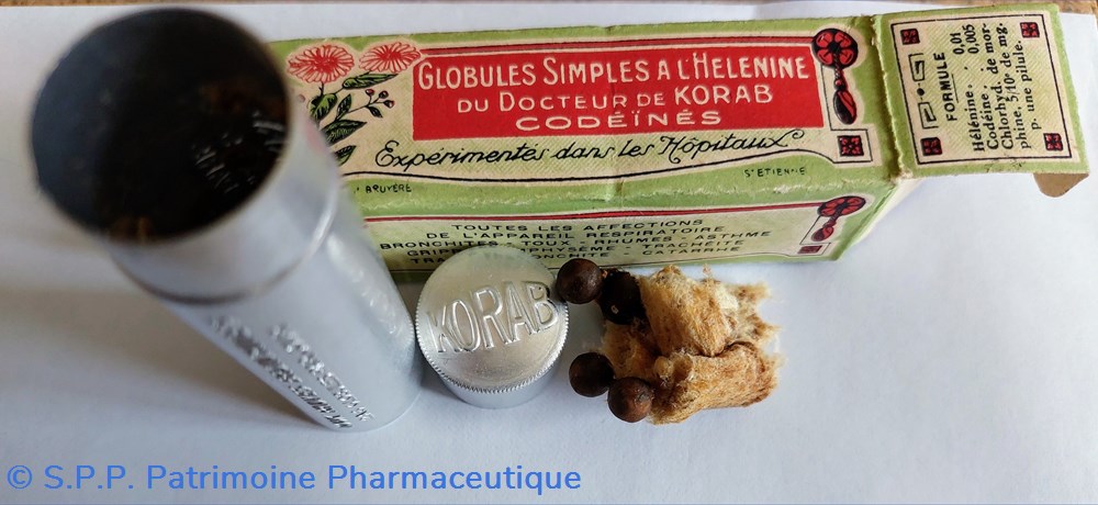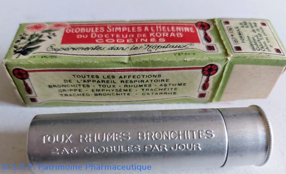 Tube en métal blanc (hauteur 7,5 Diamètre2 cm) contenant des petites billes brunes : GLOBULES SIMPLES À L'HELENINE du Dr Korab