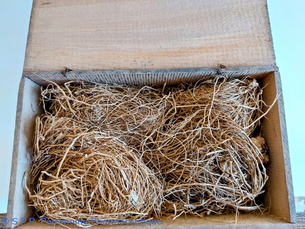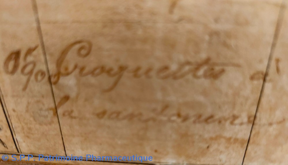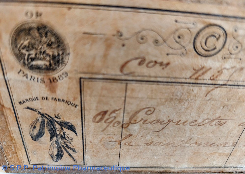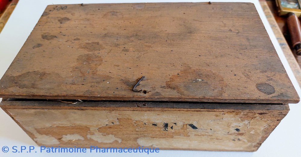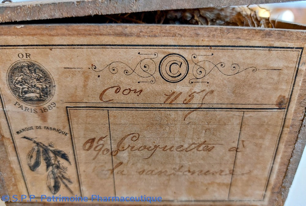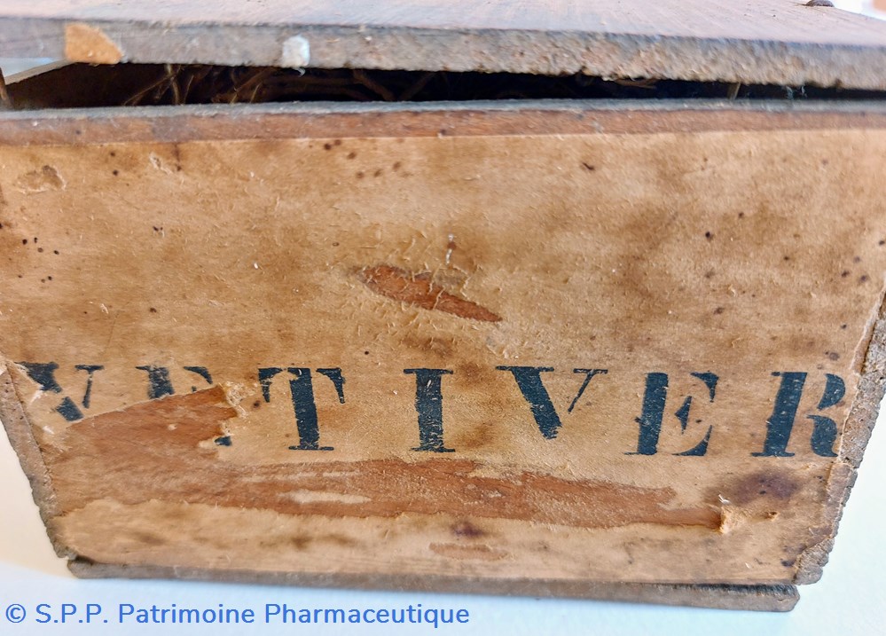 Ce coffret porte deux étiquettes latérales : Une indique " VETIVER" en gros caractères. Une autre manuscrite indique " Croquettes à la SANTONINE. Sur le couvercle on lit " 300"