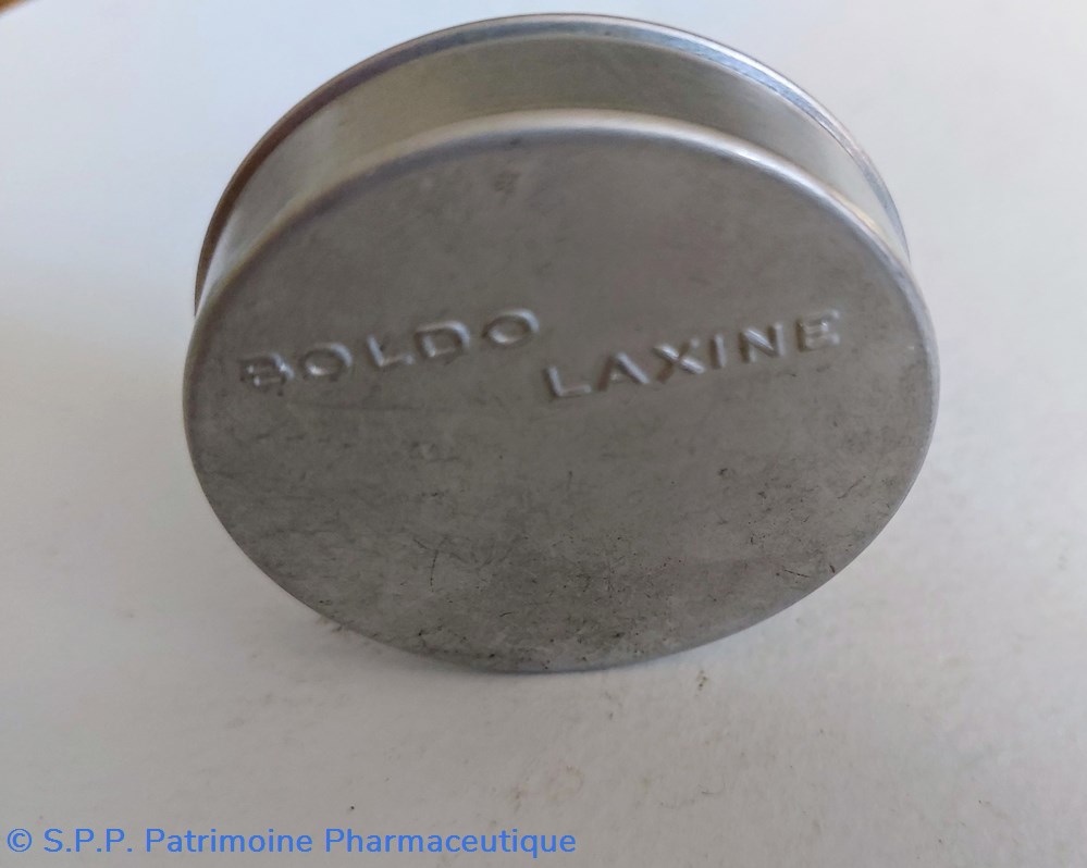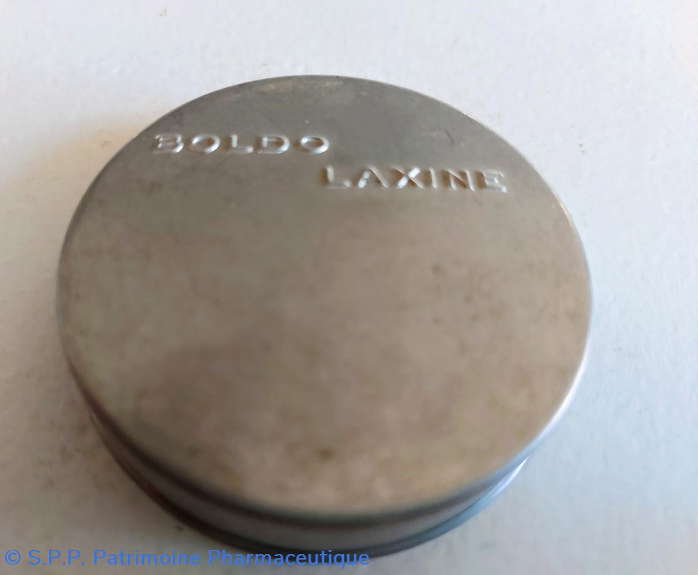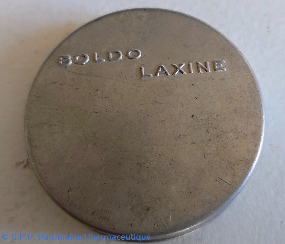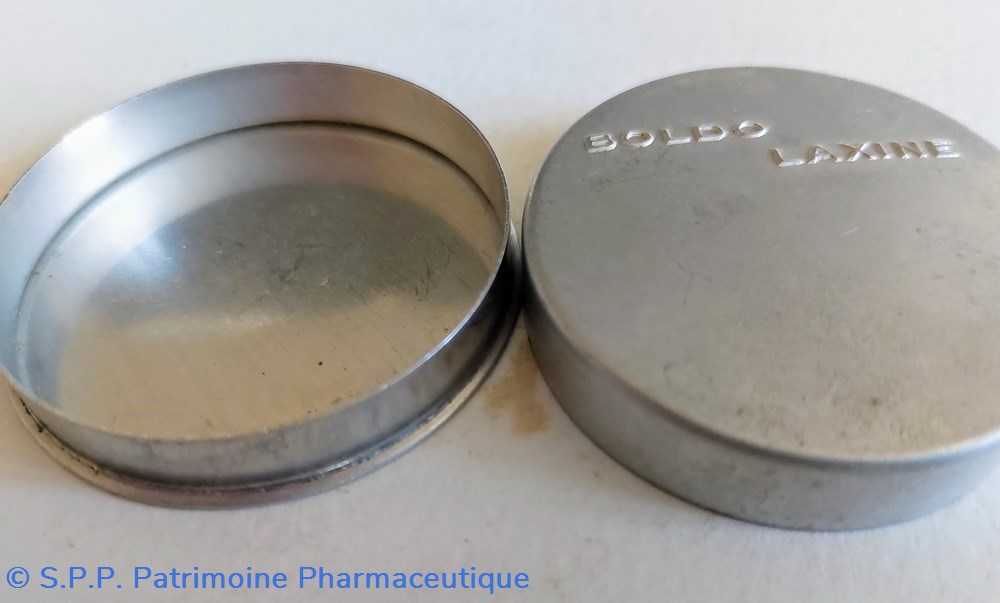 Petite boîte en métal blanc ronde de 5 cm de diamètre ayant contenu BOLDO LAXINE