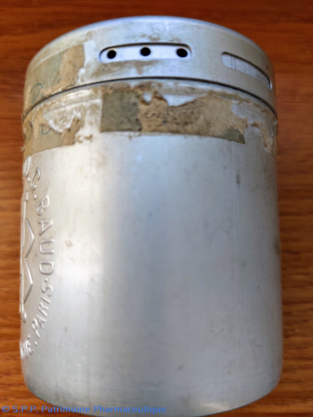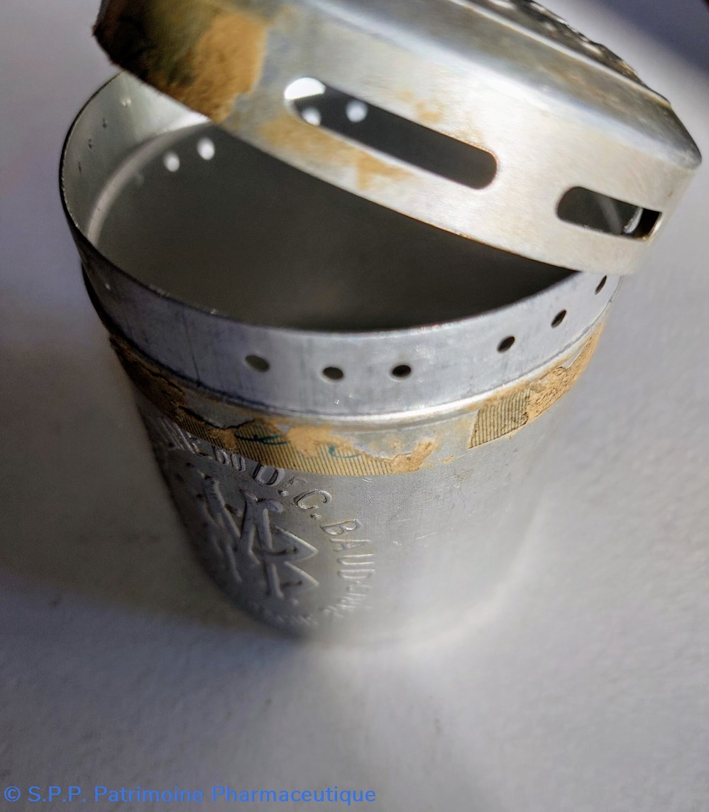 Boîte saupoudreur en aluminium avec couvercle tournant pour dosage du talc ou poudre pour enfants.