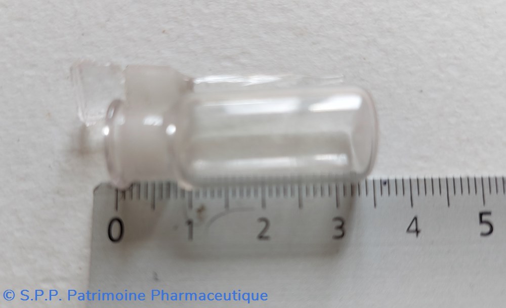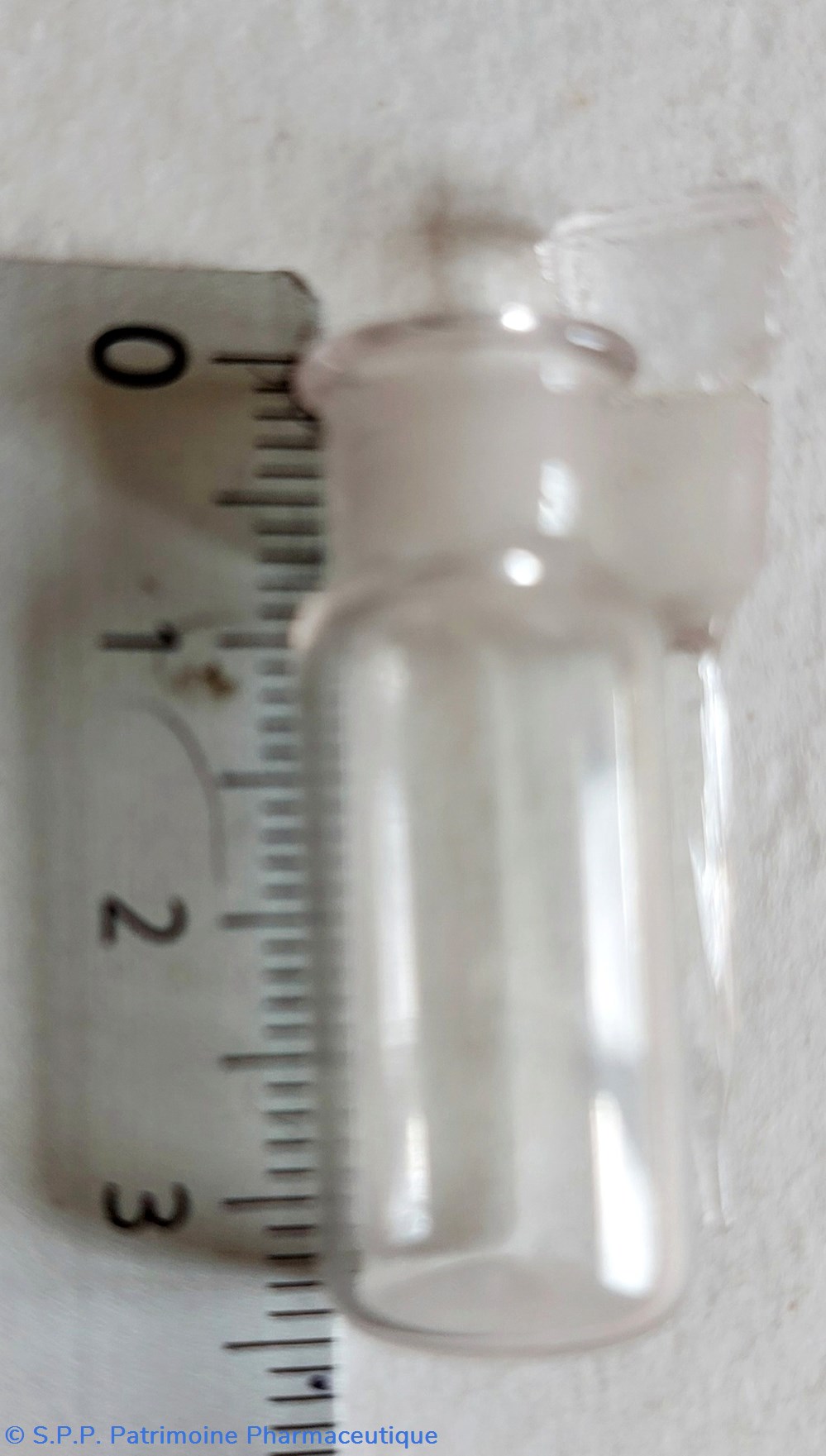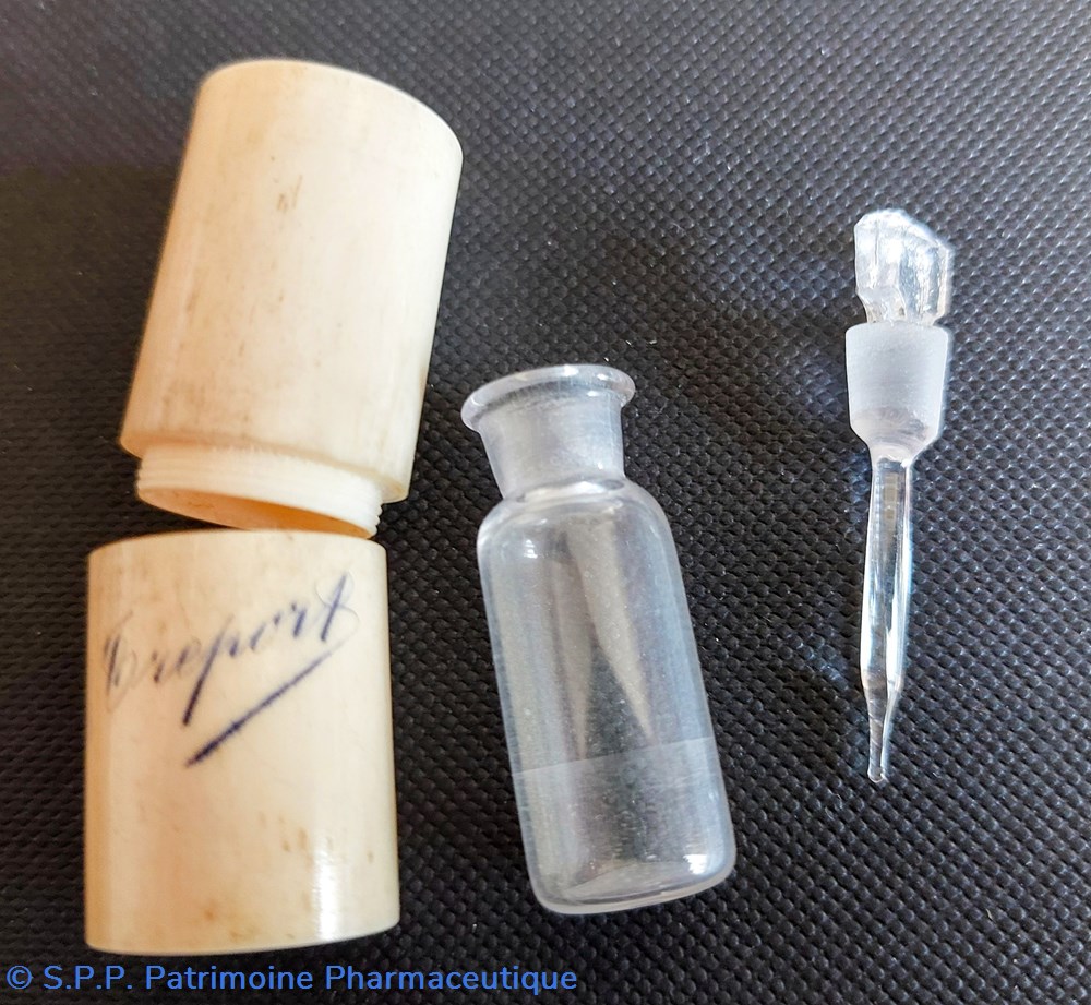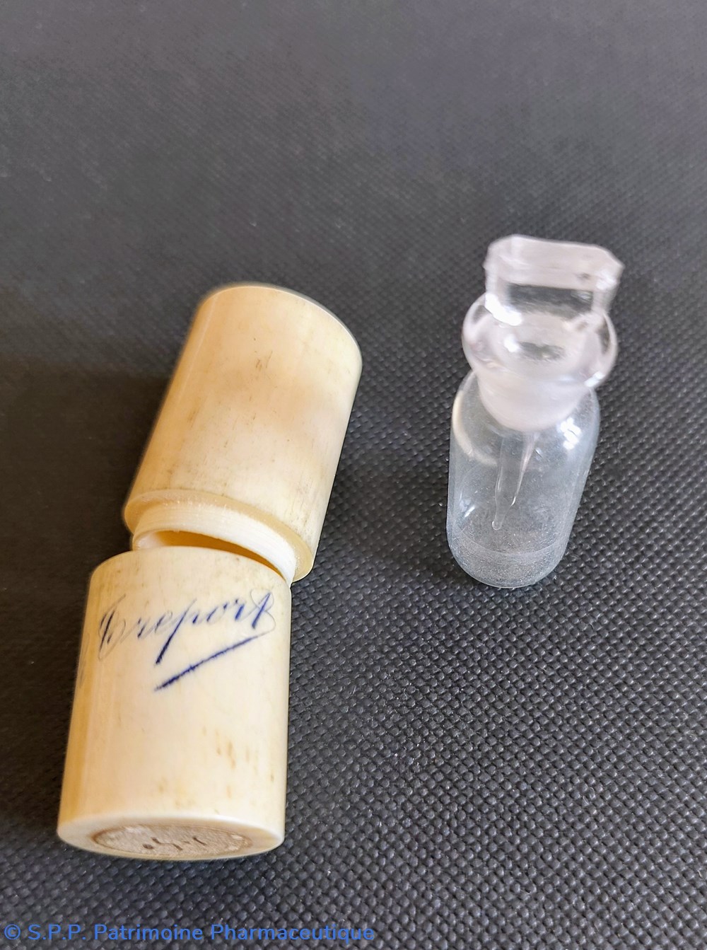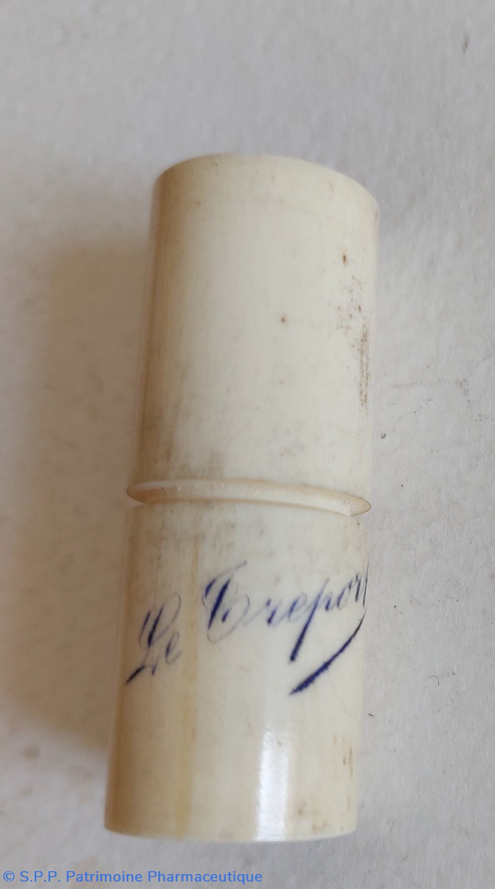 Petit tube (4,7 cm de long) en os avec bouchon vissé, marqué " Le Trèport". Ce tube contient une petite fiole vide fermée à l'émeri par un bouchon en verre portant un stylet ( tige compte gouttes) en verre éffilé.