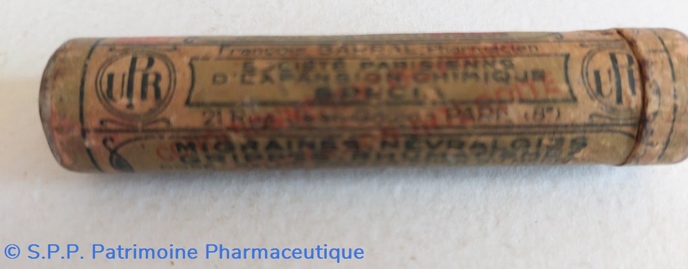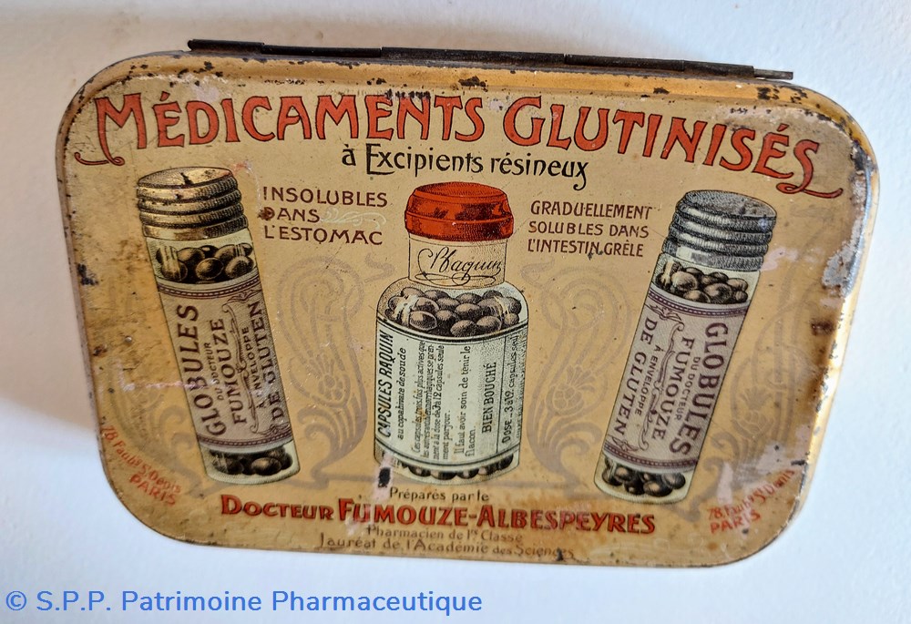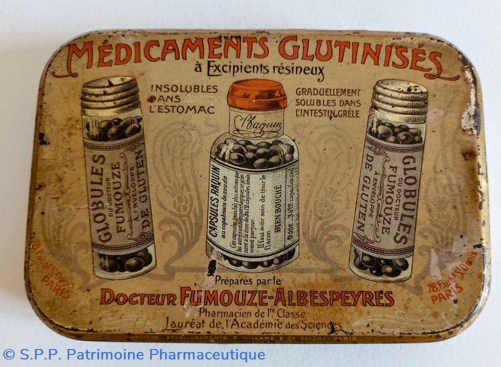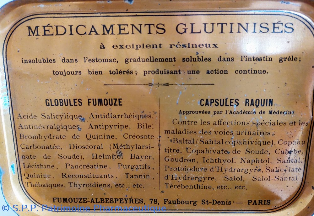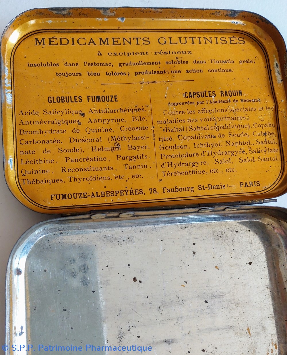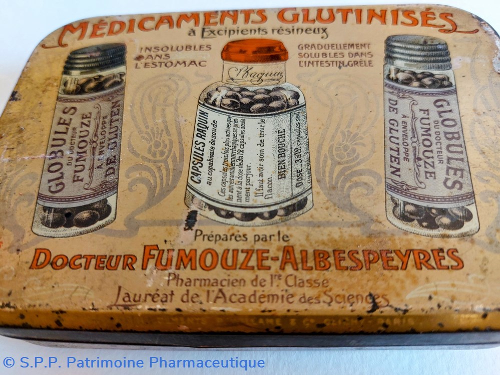 Le couvercle mentionne 2 médicaments préparés par le Docteur FUMOUZE - ALBESPEYRES à Paris :