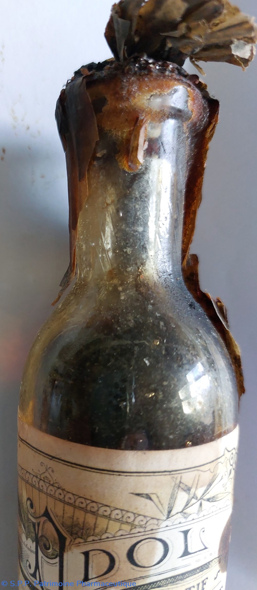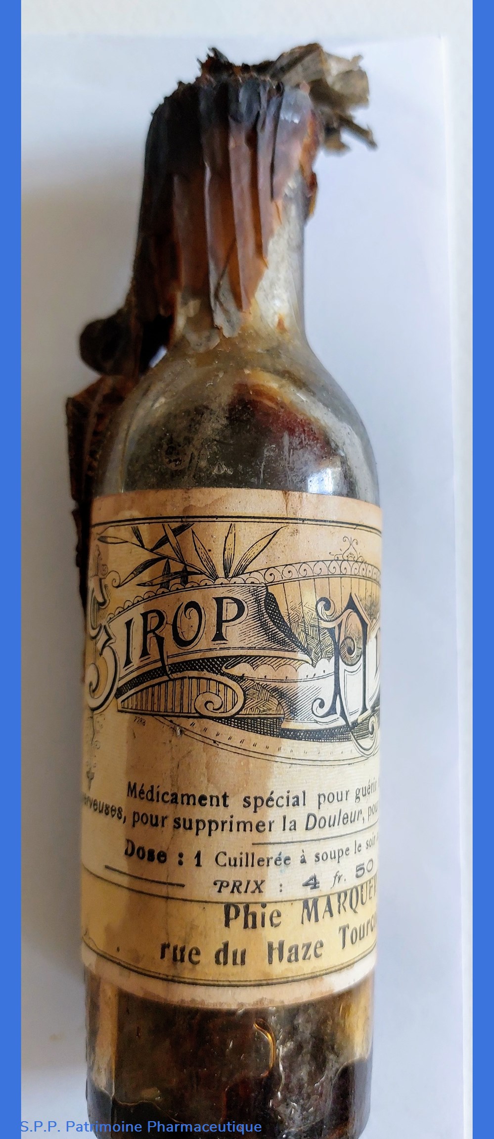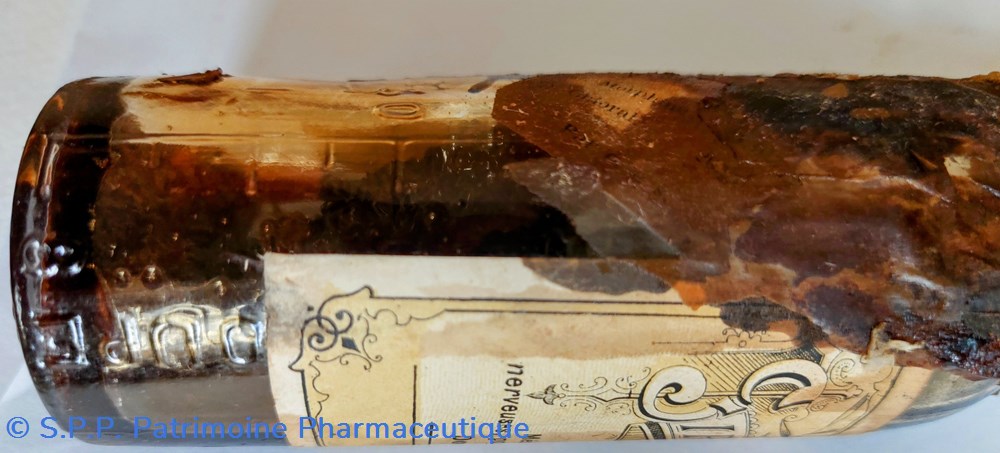 Flacon marqué "125" dessous et graduée en grammes. Mauvais état suite à des écoulements du sirop