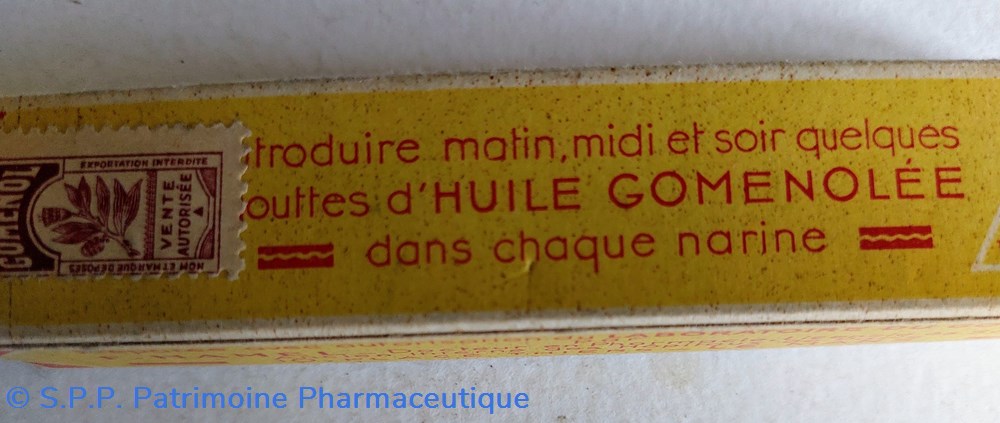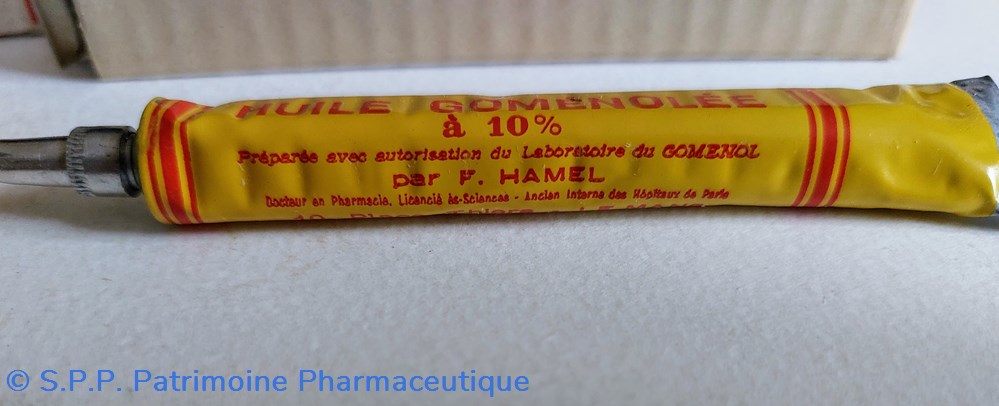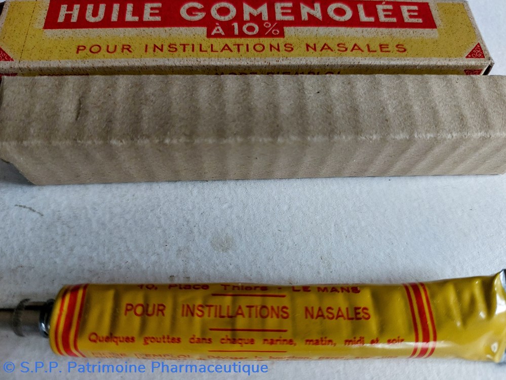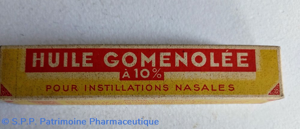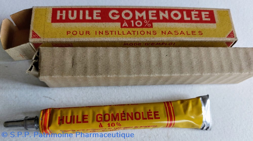 Petit tube métallique de 11 cm d' HUILE GOMENOLLEE à 10% pour instillations nasales. Conditionnement en carton long de 12 cm