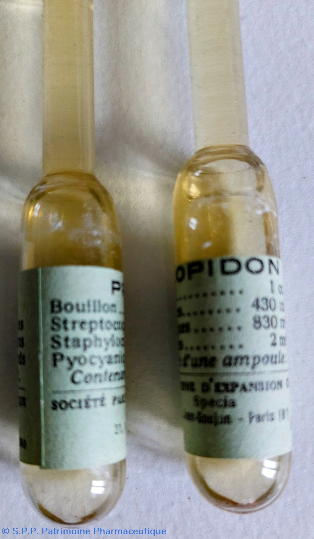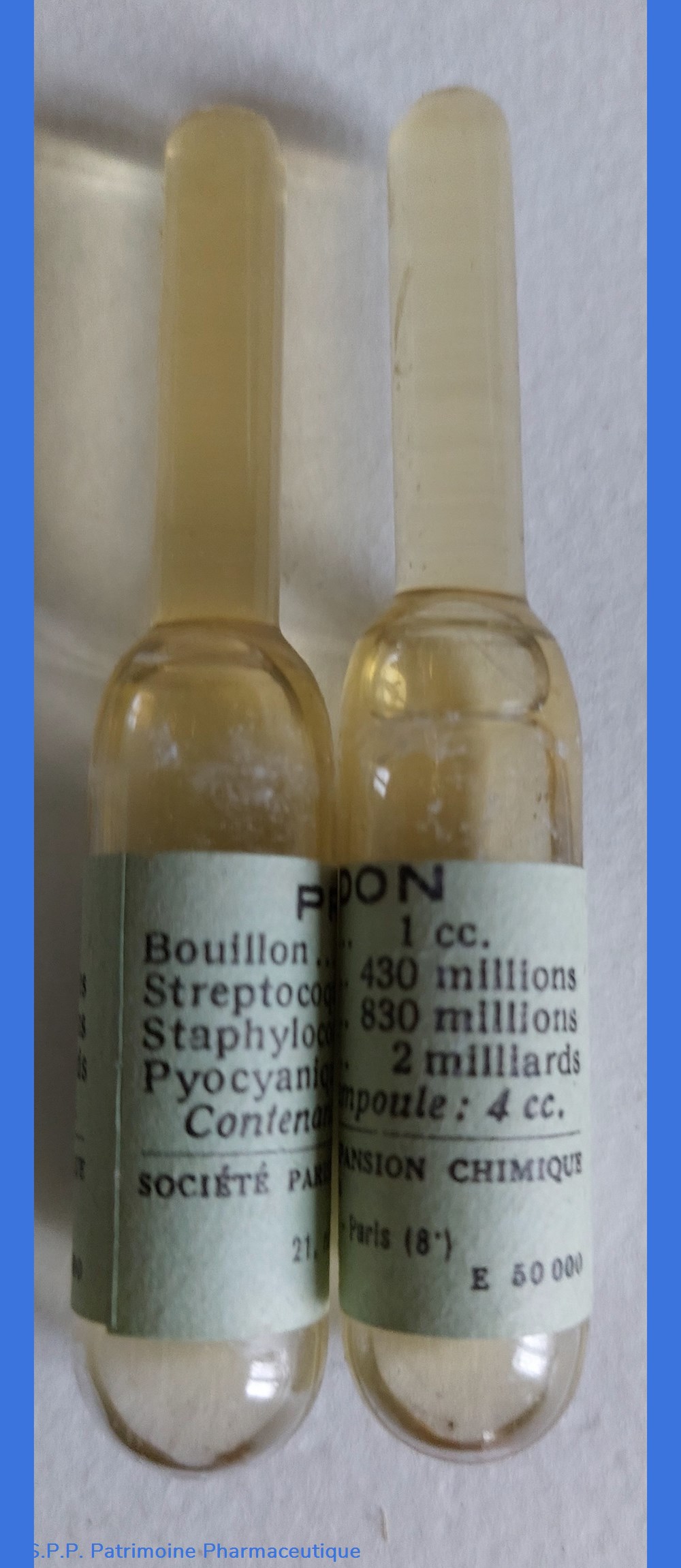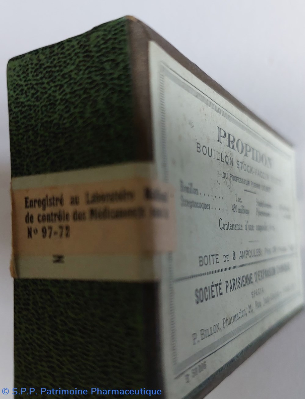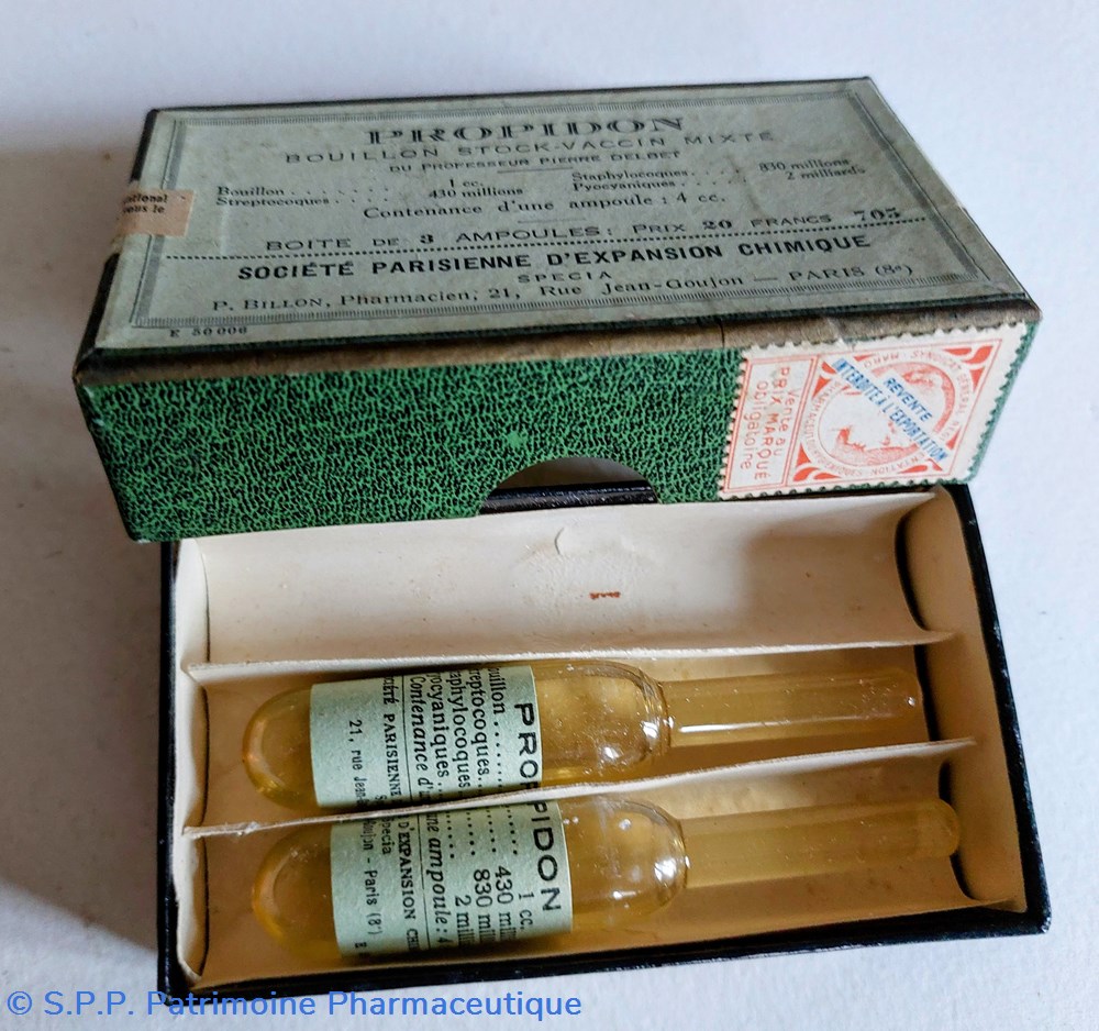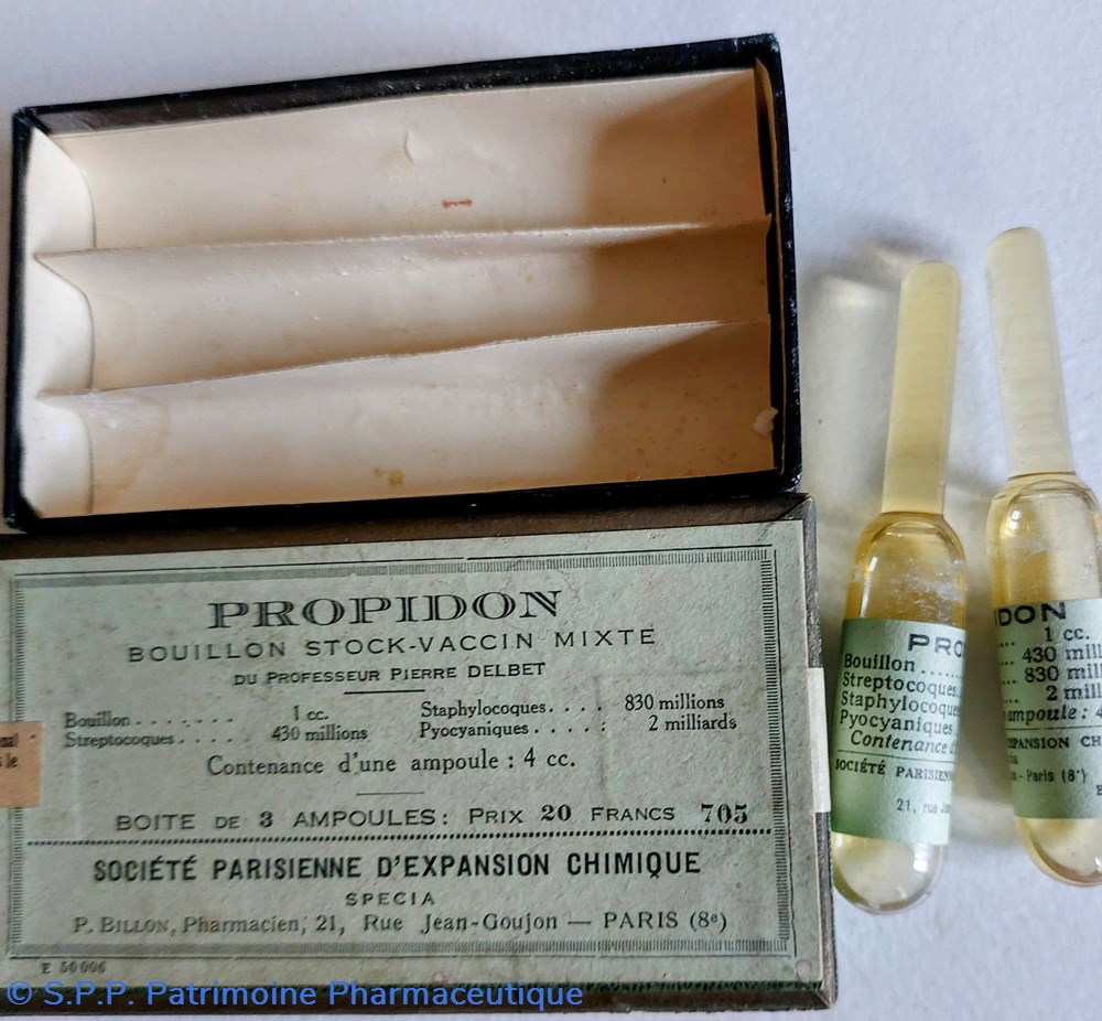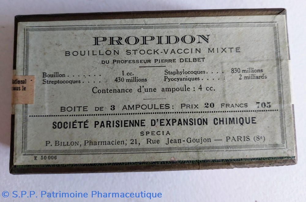 La boîte de 3 ampoules 20 Francs contenant bouillon 1cc streptocoques 430 millions staphylocoques 830 millions pyocianques 2 milliards