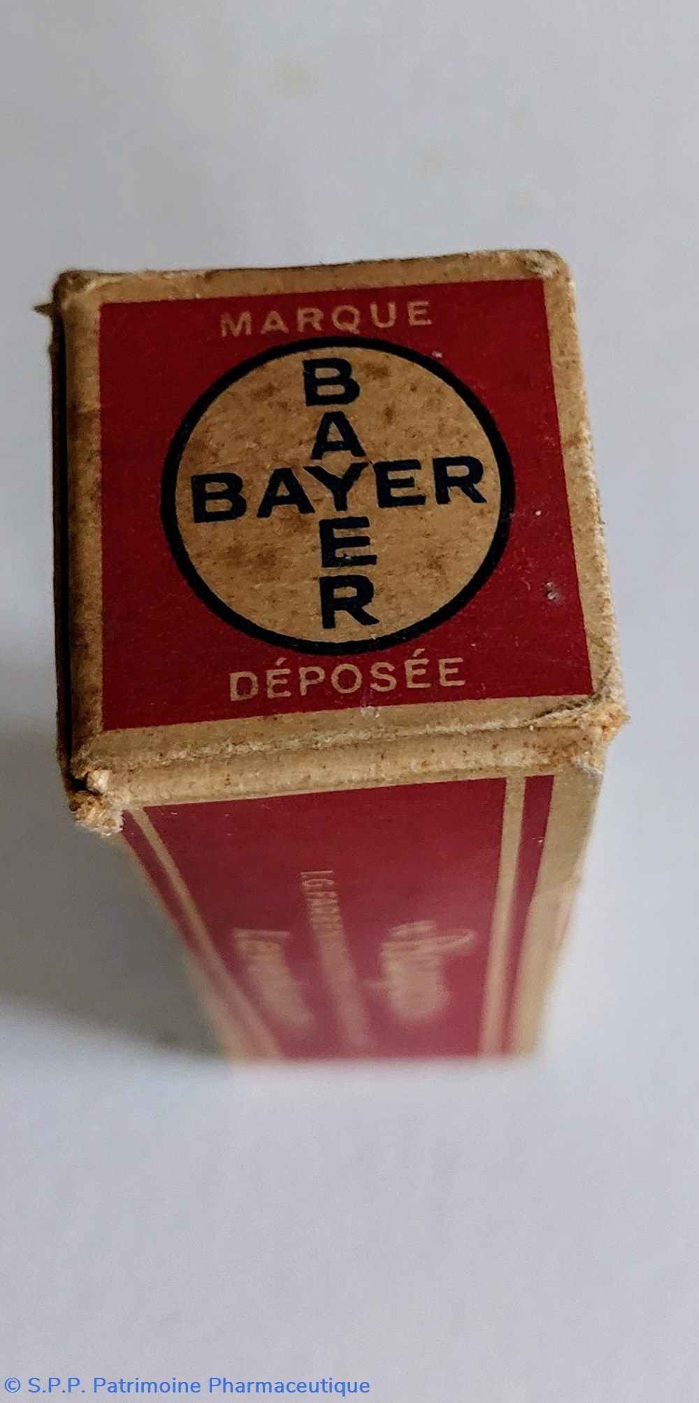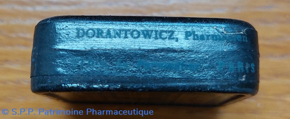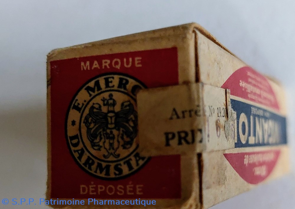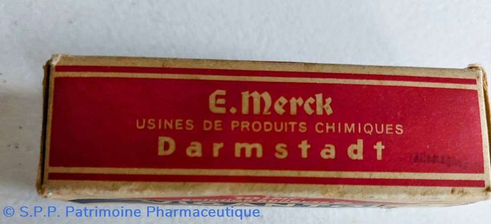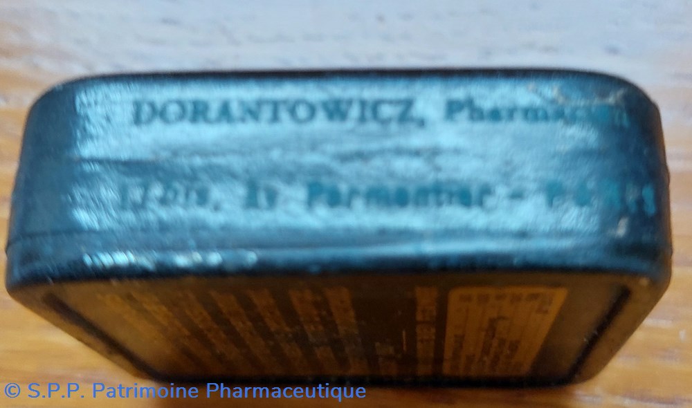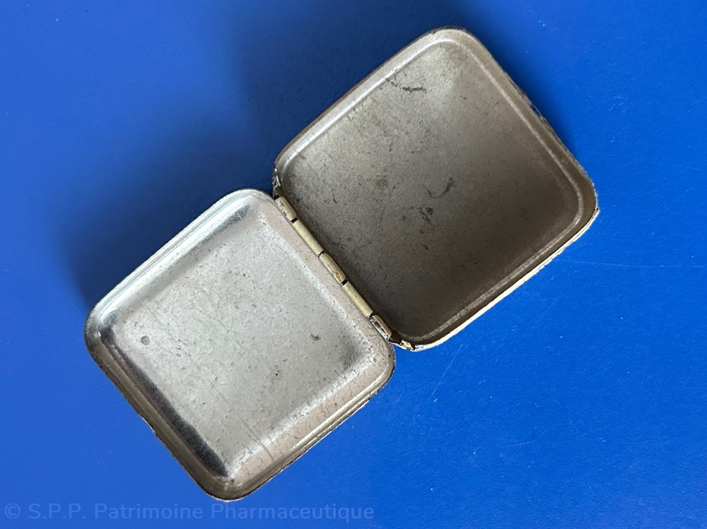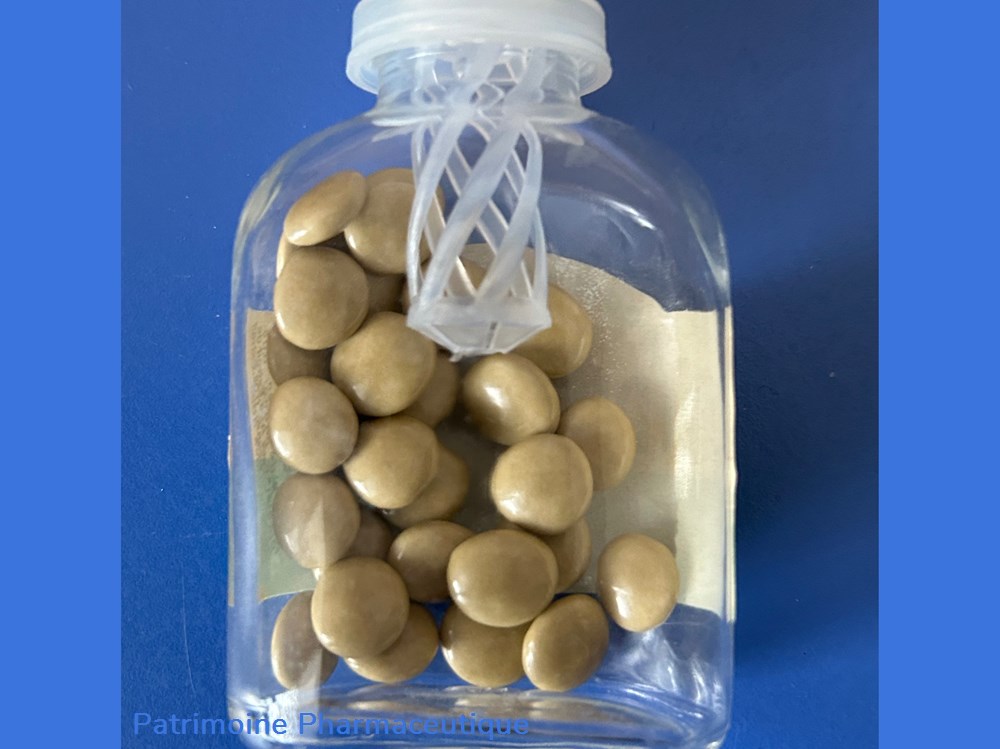 Petit flacon en verre avec un bouchon en plastique contenant encore des comprimés dragéifiés. Certainement ce flacon devait ête placé originellement dans une boîte en carton. Hauteur du flacon : 7,5 cm largeur : 5 cm épaisseur : 3 cm.