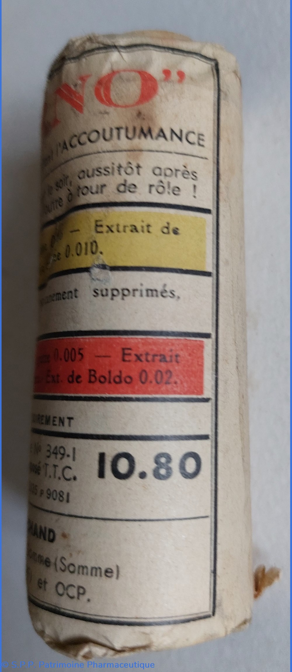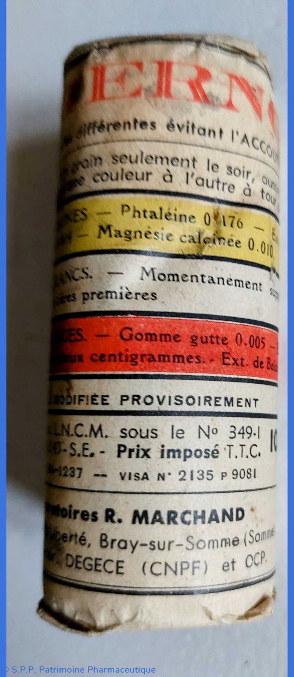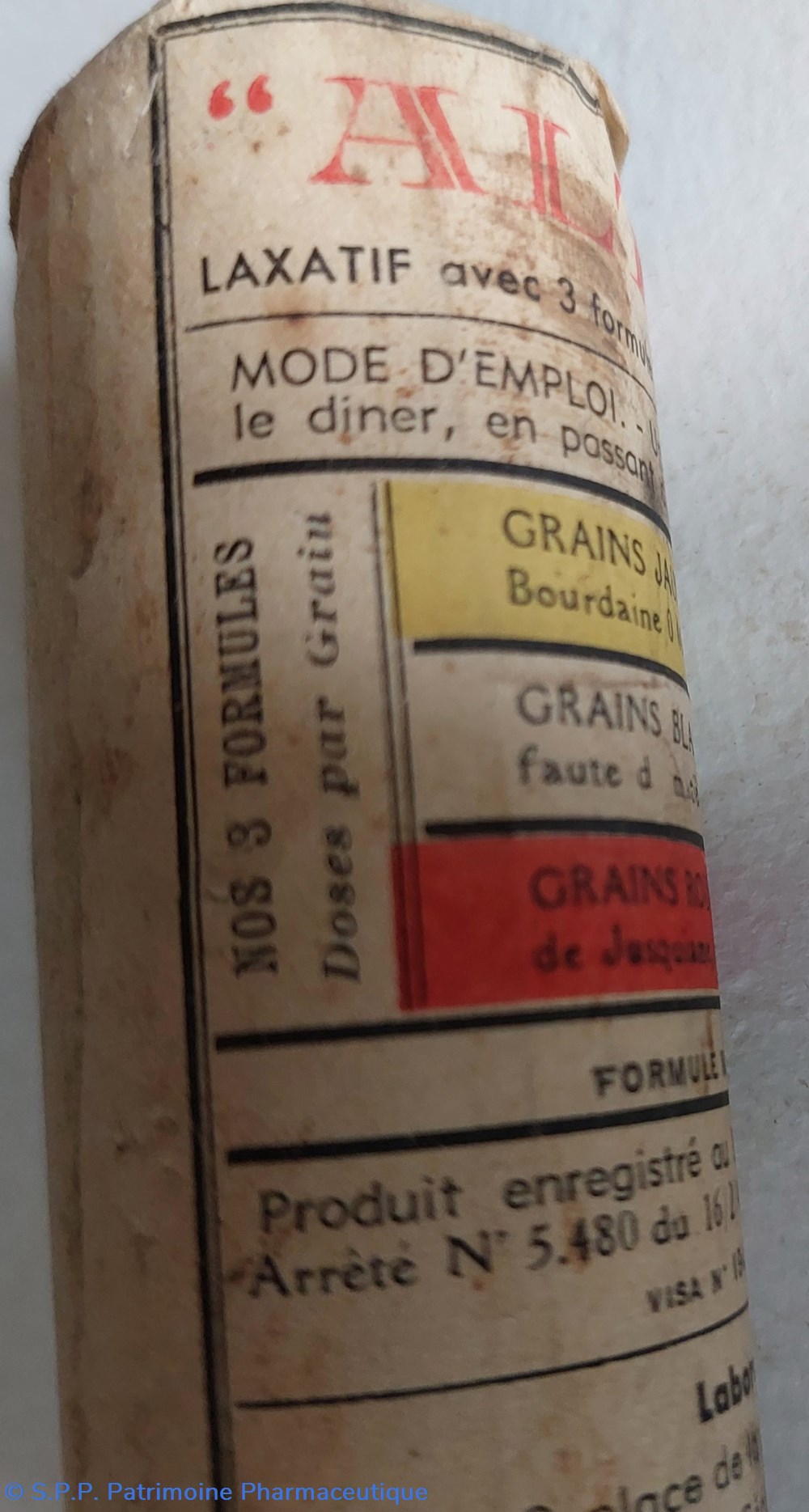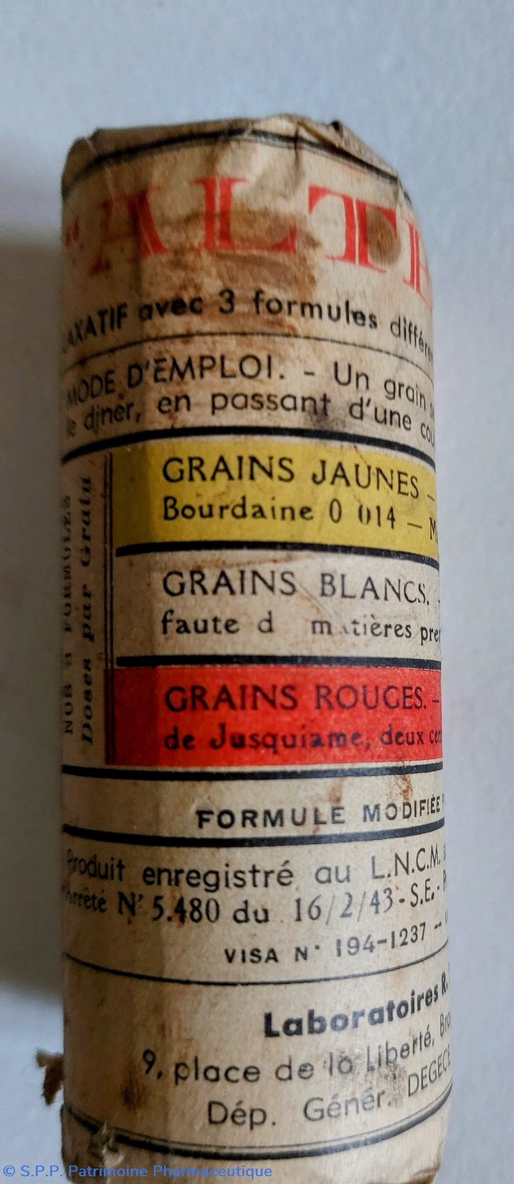 Laxatif sous 3 formules (pour éviter l'accoutumance) de grains de couleurs différentes (Jaune avec Phtaléine, bourdaine et magnésie caféinée) ( Blanc momentanément supprimés faute de matières premières ) ( Grains rouges avec gomme gutte, extrait de jusquiame et extrait de boldo )
