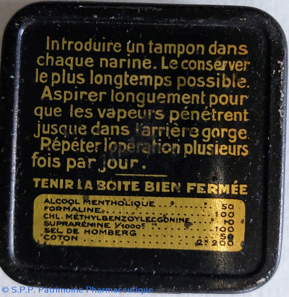 , " introduire un tampon D'OUATE RHINOPHILINE dans chaque narine..." 1500 à la base de formaline et suprarénine..
