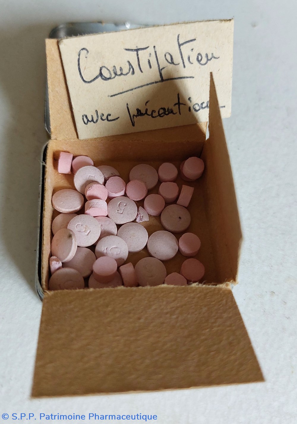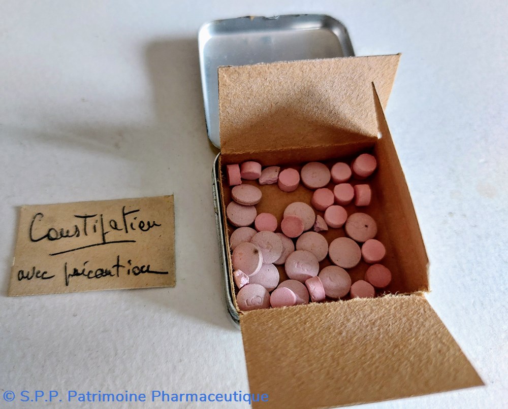 Petite boîte métallique de poche contenant des petits comprimés de couleur rose clair.