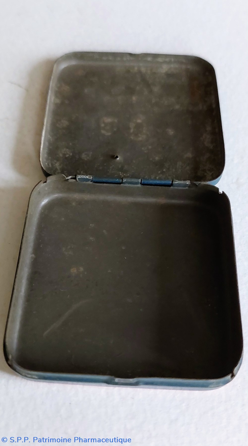 Boîte métallique vide de forme parallélépipèdique avec couvercle sur le dessus indépendant11.5 x 8.5 x 3.5 cm.
