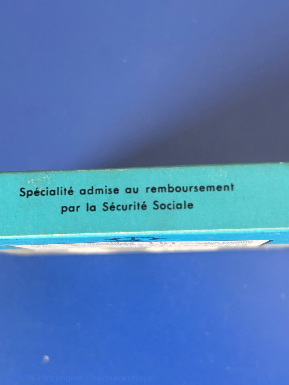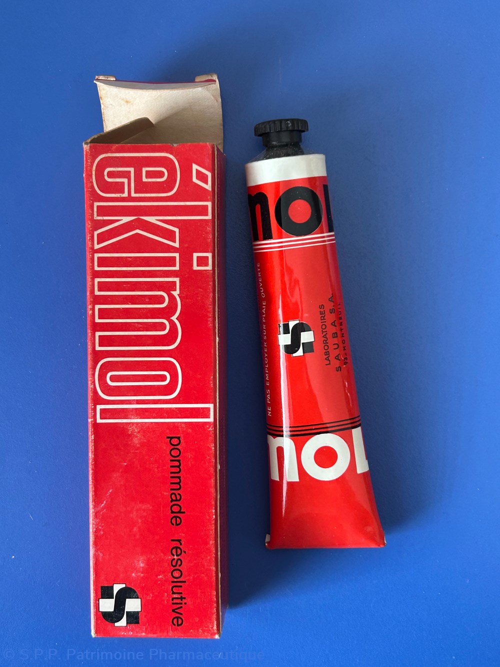 boîte allongée en carton avec ouvertures aux deux extrémités. 15 x 2.5 x 4 cm. Cette boite contient un tube de pommade bouché par un bouchon noir en bakélite. Il mesure 13,5 cm et n'a jamais été ouvert.