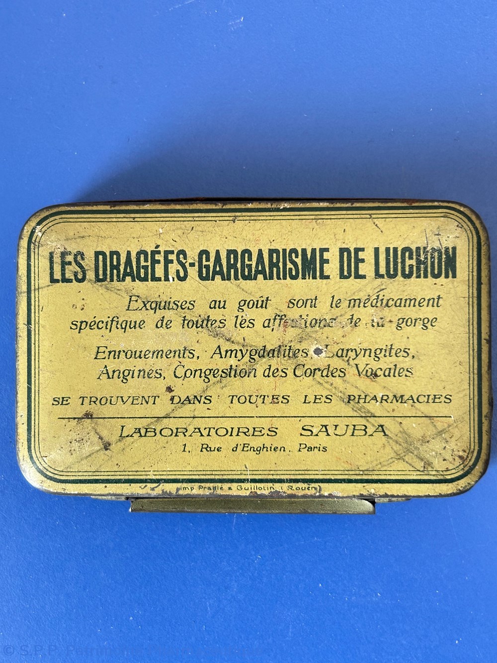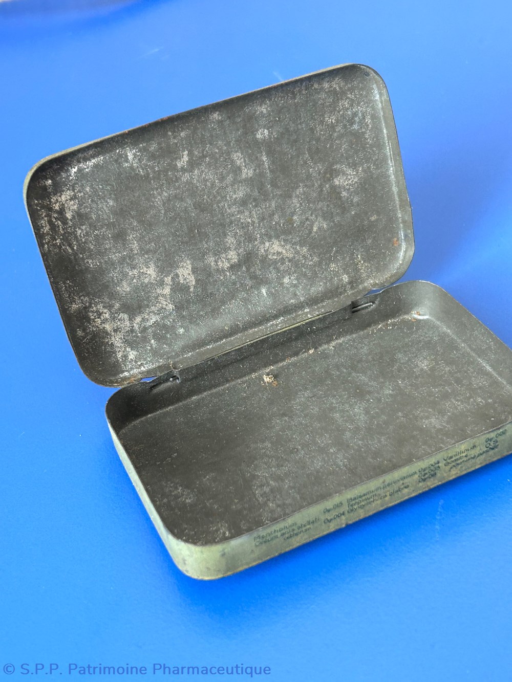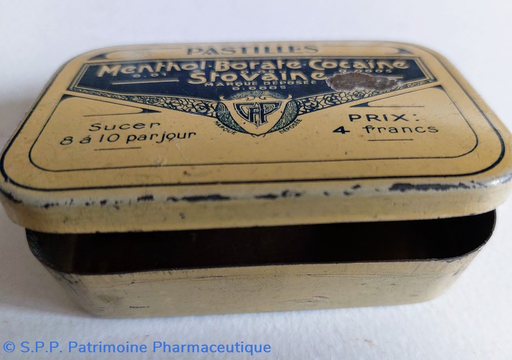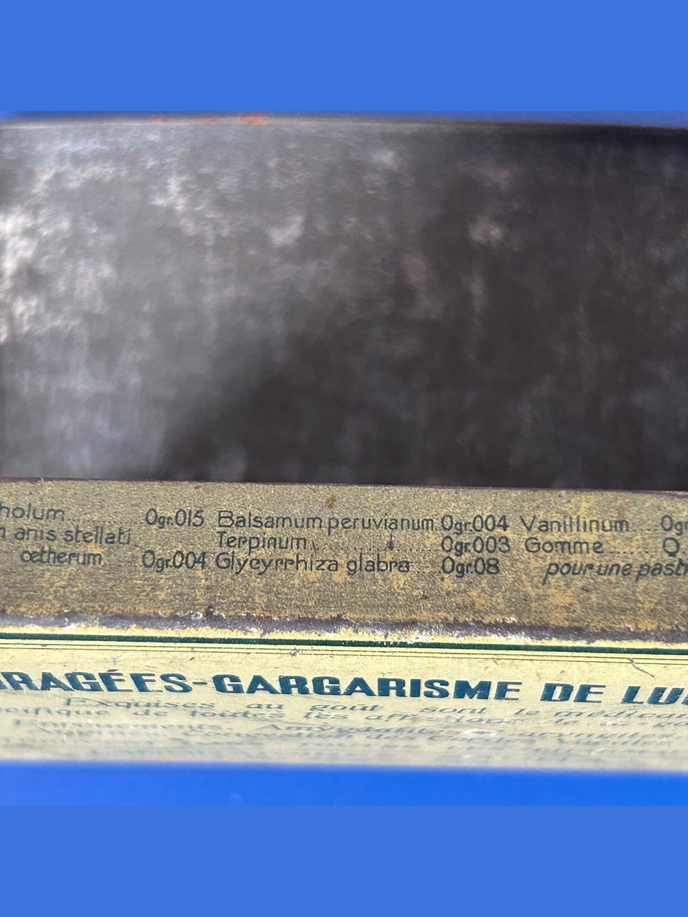 Boîte métallique vide 85 *5,5 cm épaisseur 2 cm ayant contenu des PASTILLES MENTHOL BORATE COCAÏNE STOVAINE