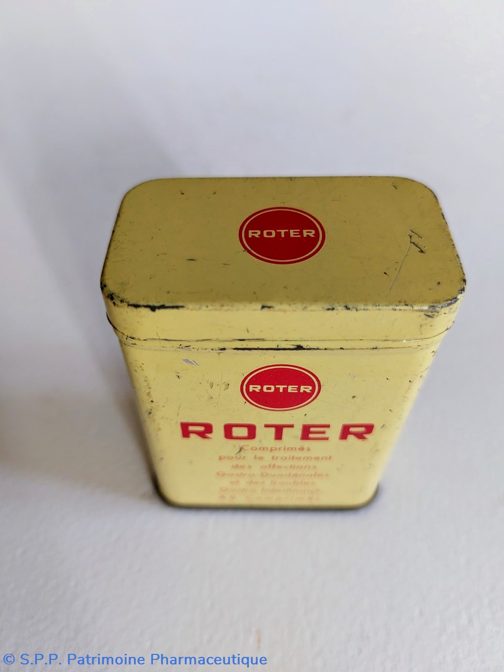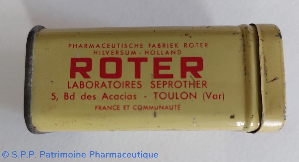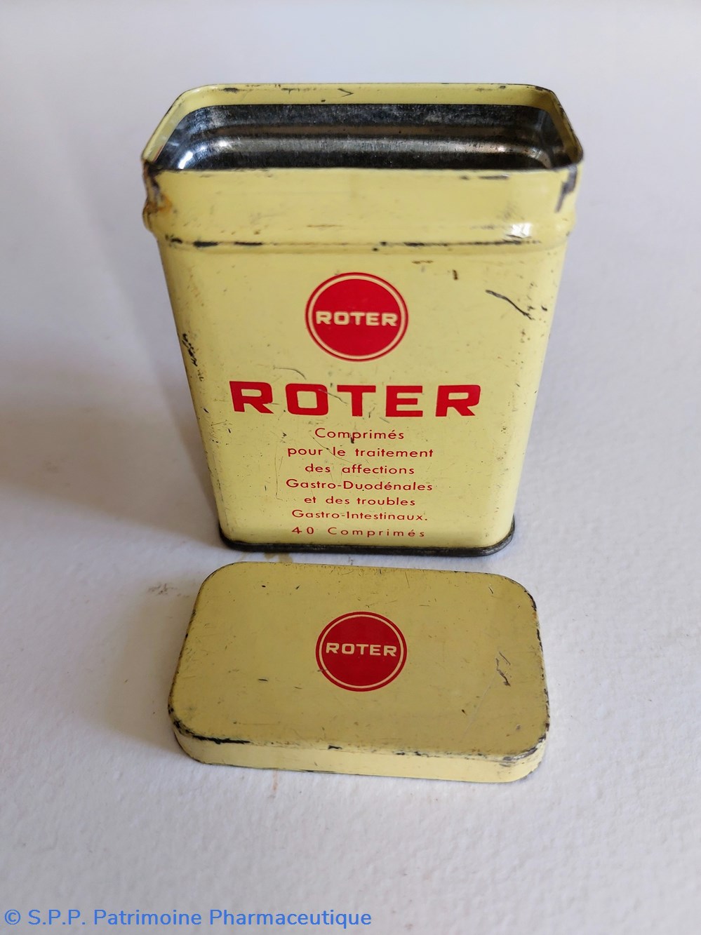 Boîte métallique vide ayant contenu 40 comprimés ROTER pour le traitement des affections gastro- duodénales et des troubles gastro- intestinaux.