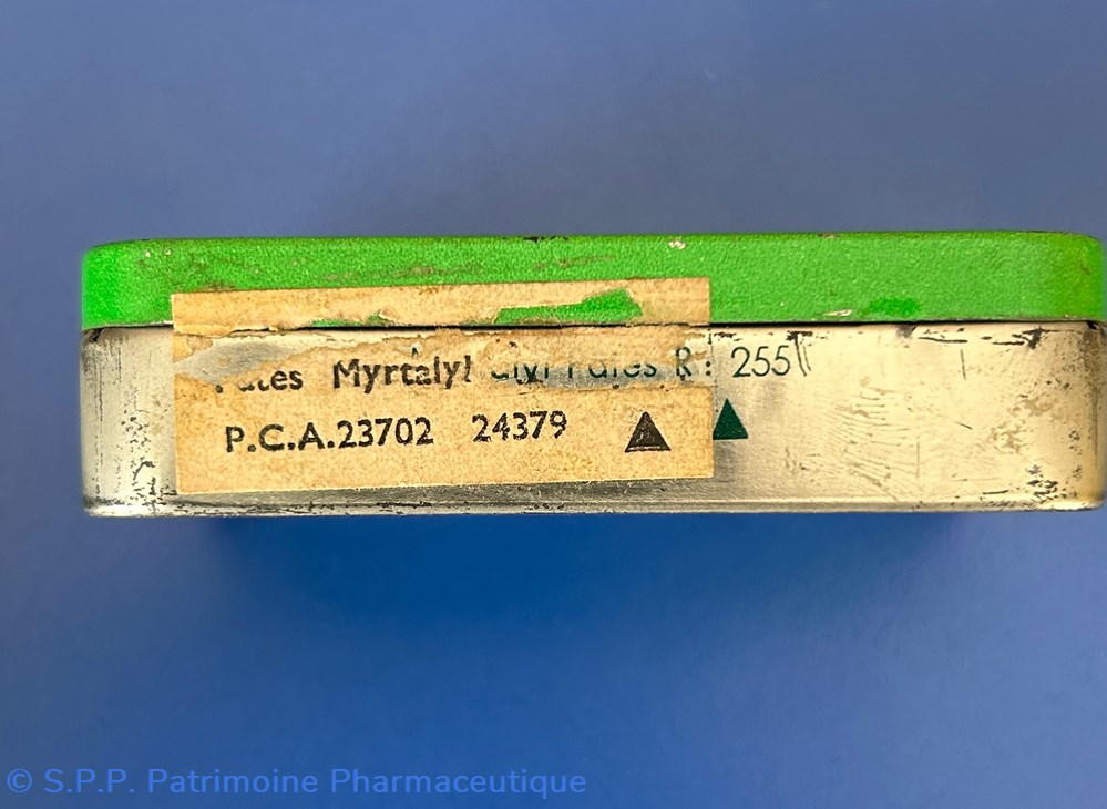 Petite boîte en carton de forme parallélépipèdique dont les ouvertures sont à chaque extrêmité 8.5 x 3.5 x 3.5 cm contenant un flacon cylindrique en verre fermé par un bouchon plastique. Ce tube content encore des dragées. A l'intérieur également une notice.