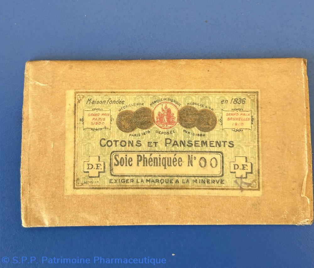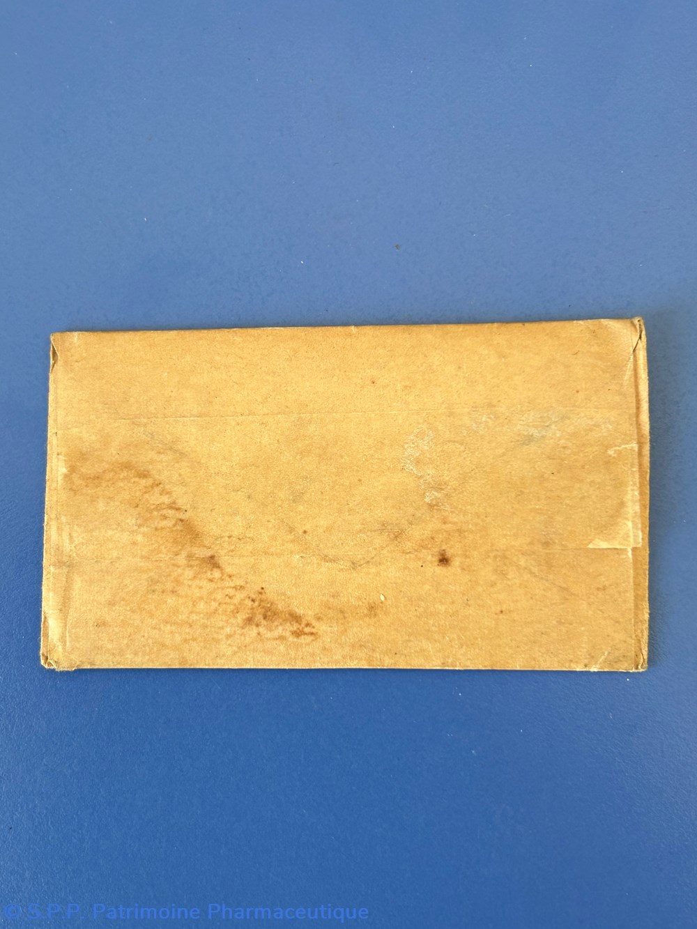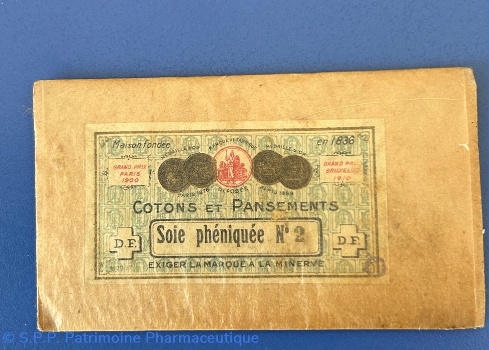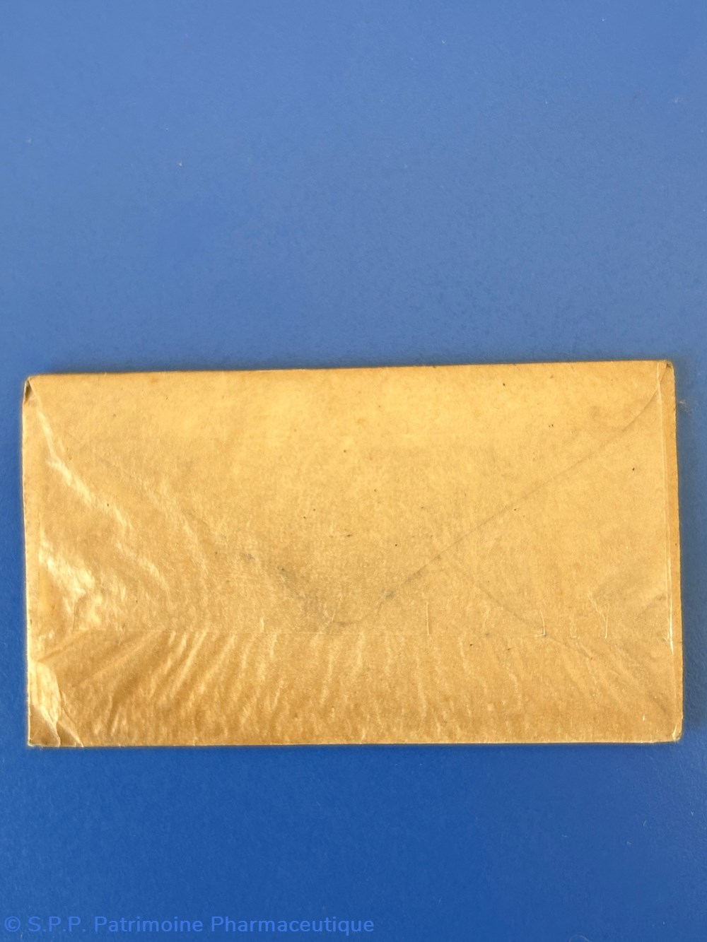 Petite enveloppe en carton 9.5 x 5.5 cm recouverte de papier cellophane jauni. Cotons et Pansements
