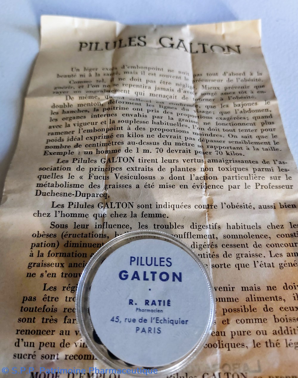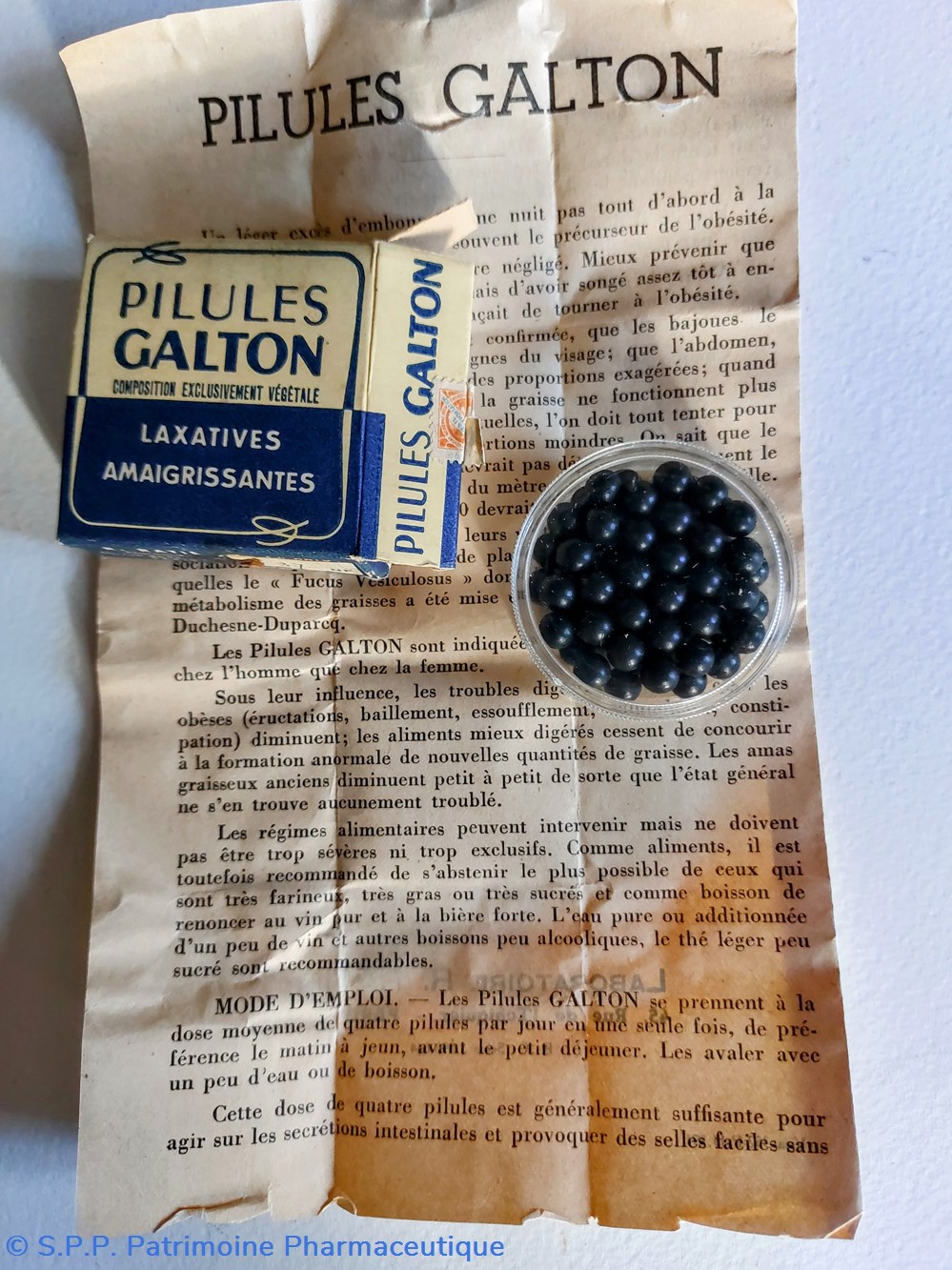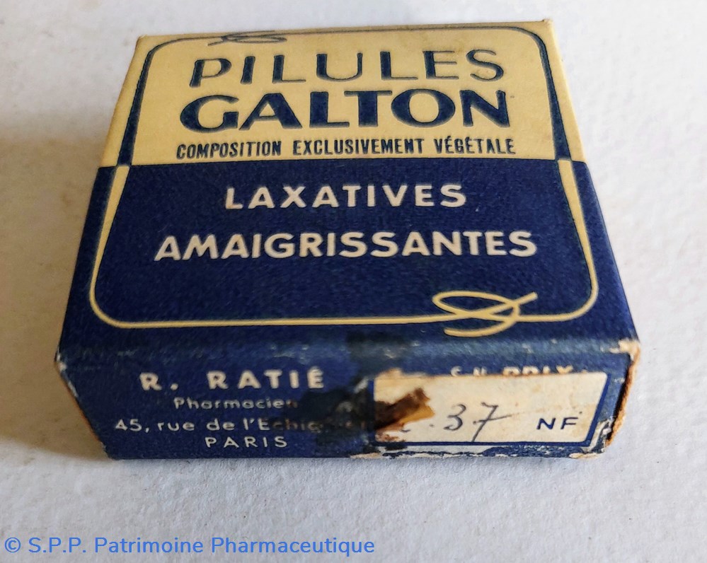 Cette boîte est intacte et contient des petites "billes" noires dénommées pilules GALTON.