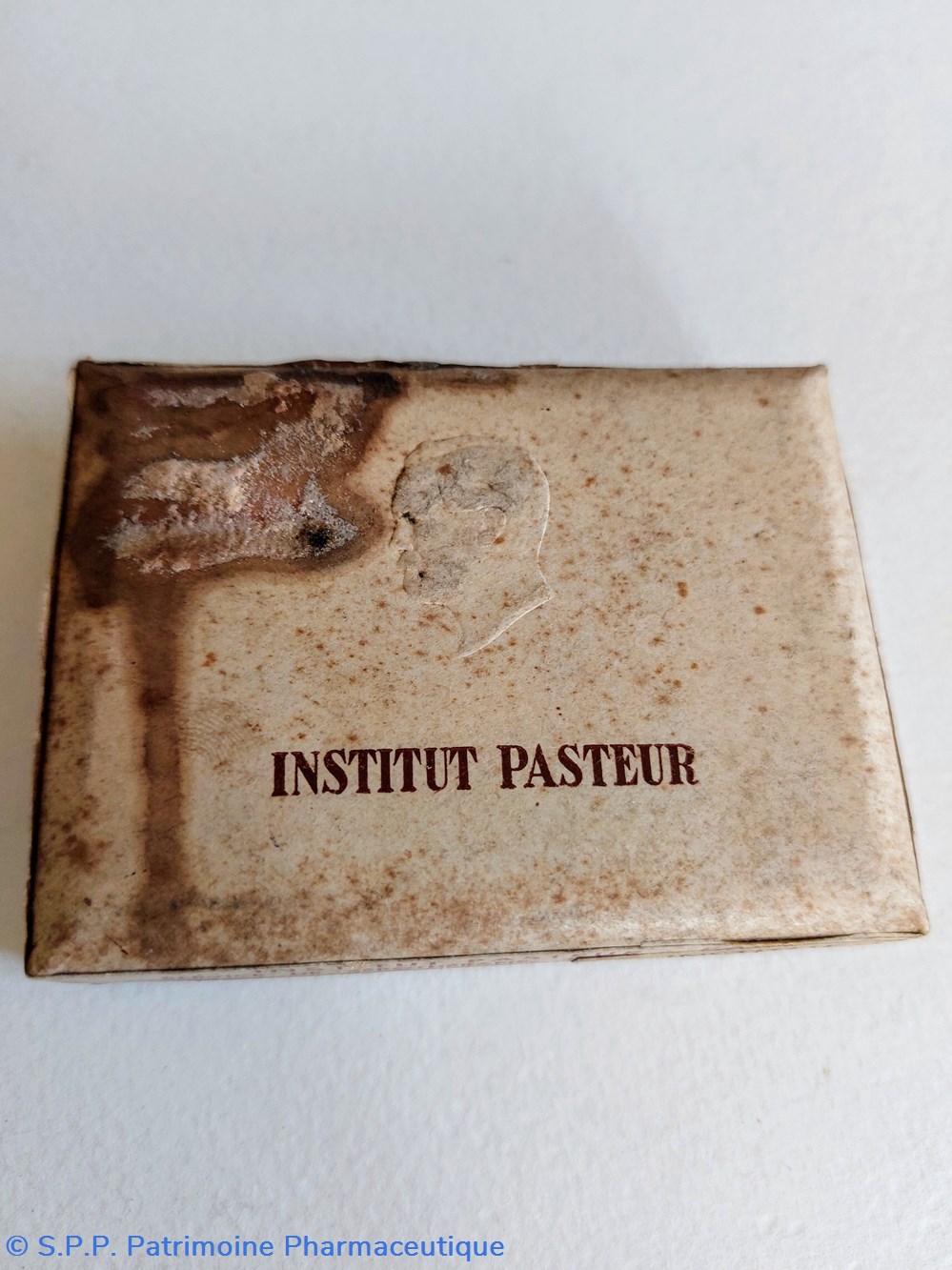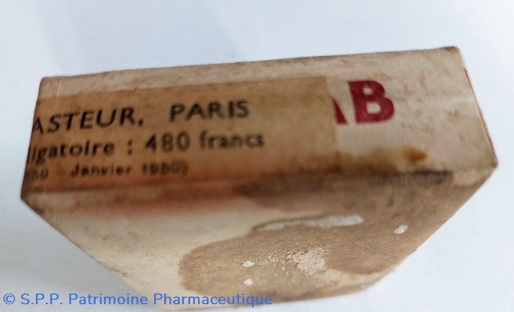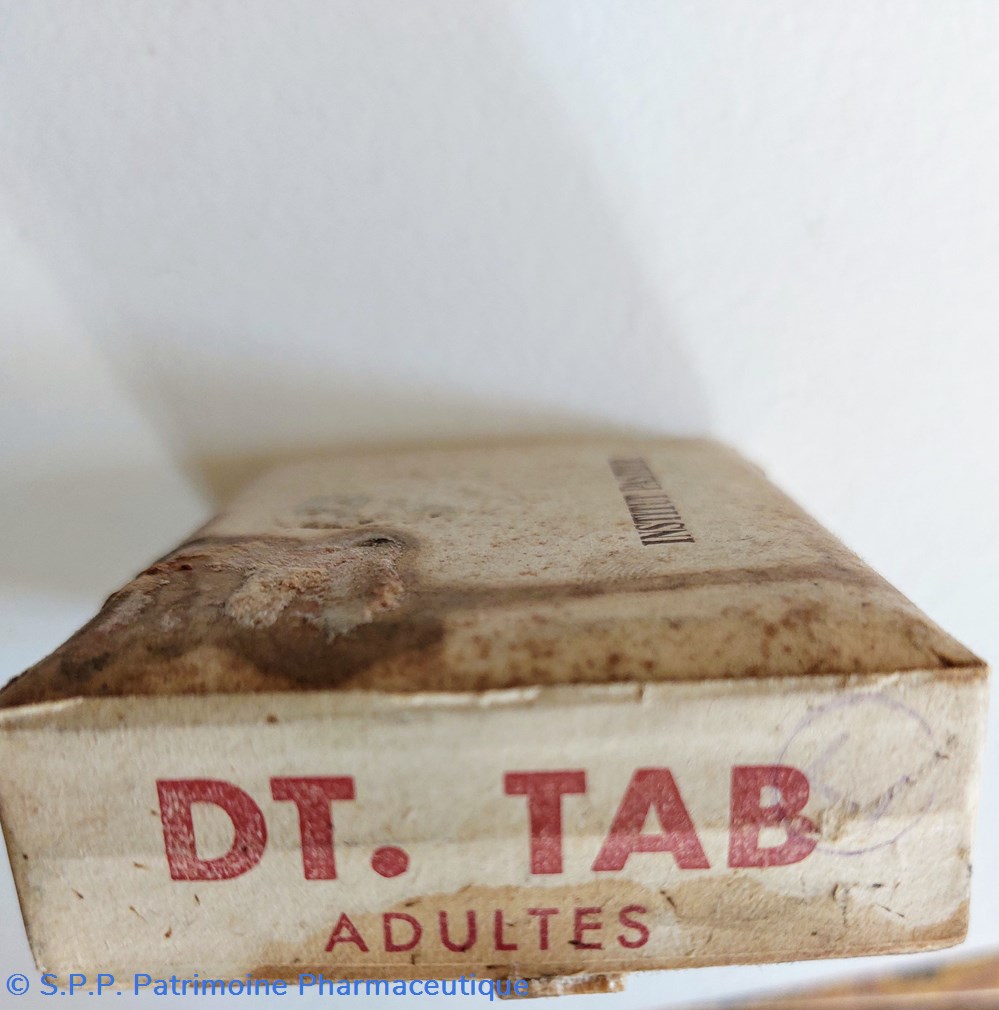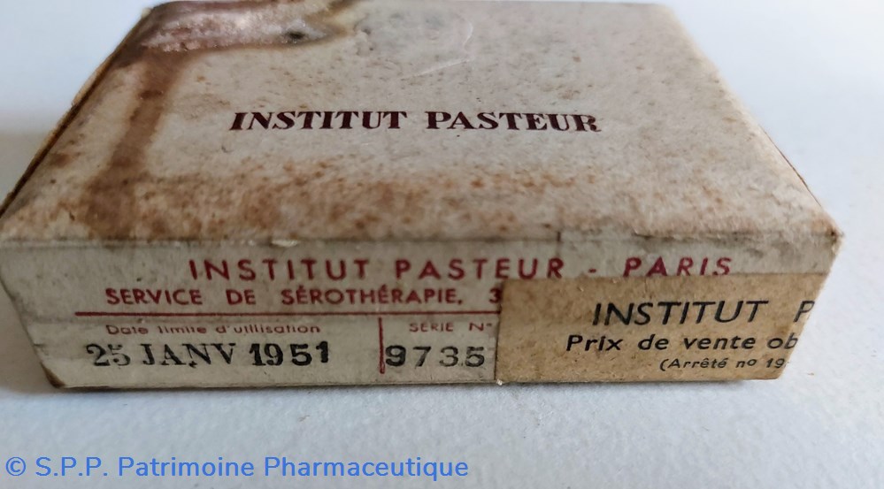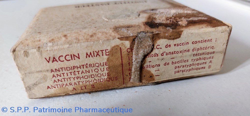 Boîte carton 8,5 *6 cm en mauvais état contenant des vaccins mixte antidiphterique, antiitetanique, antityphoidique antiparatyphoidique INSTITUT PASTEUR