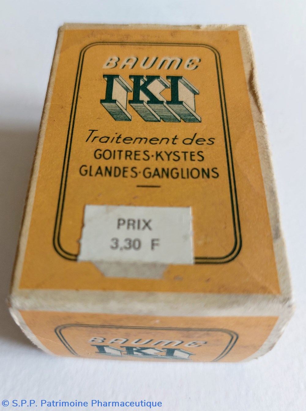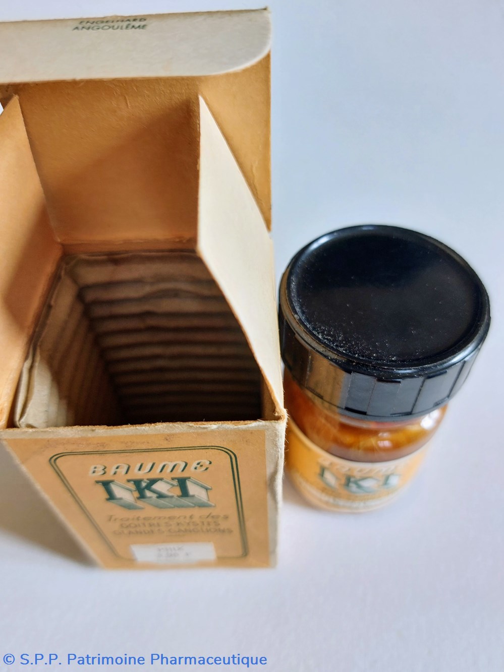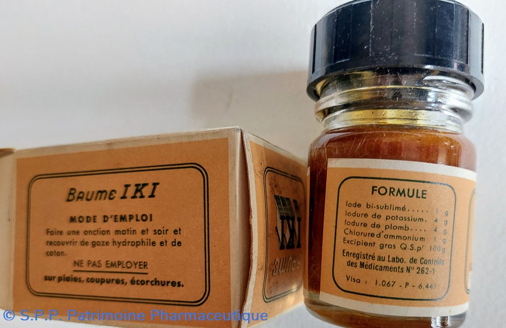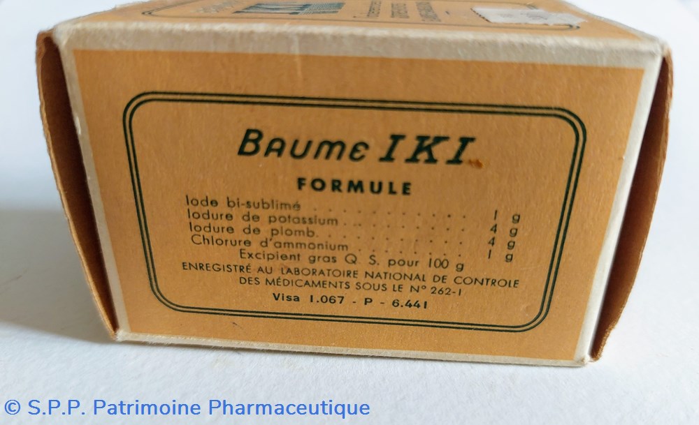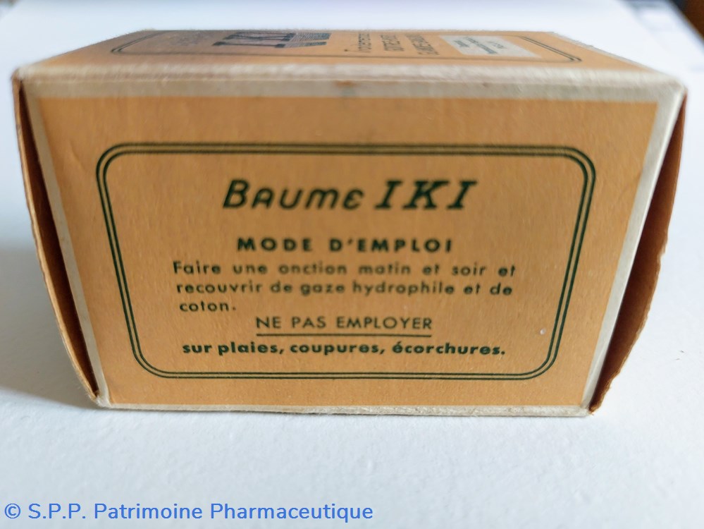 Emballage carton contenant un flacon rempli de BAUME IKI HAUTEUR 7 cm Diamètre base 3,5 cm.