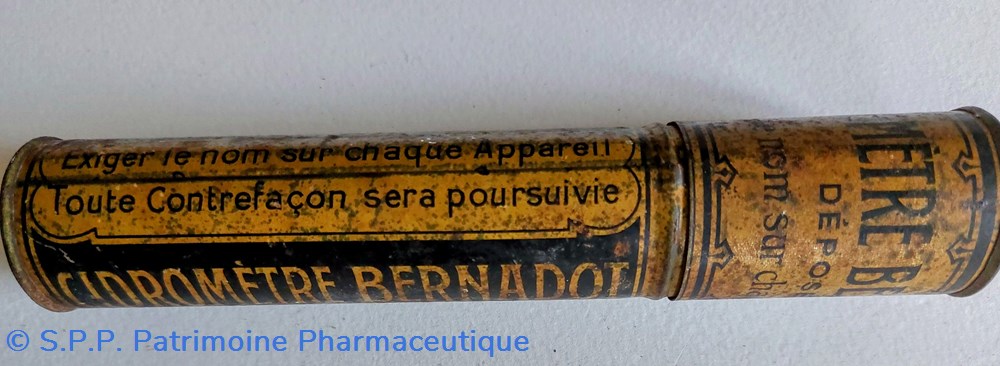 Tube métallique 16 cm Diamètre 3,2 cm contenant un CIDROMÉTRE BERNADOT. Il s'agit d'un tube spécial en verre gradué de zéro à 15. Il Cet instrument n'est fiable que pour le cidre. Il indique le degré alcoolique sans recourir à la distillation.