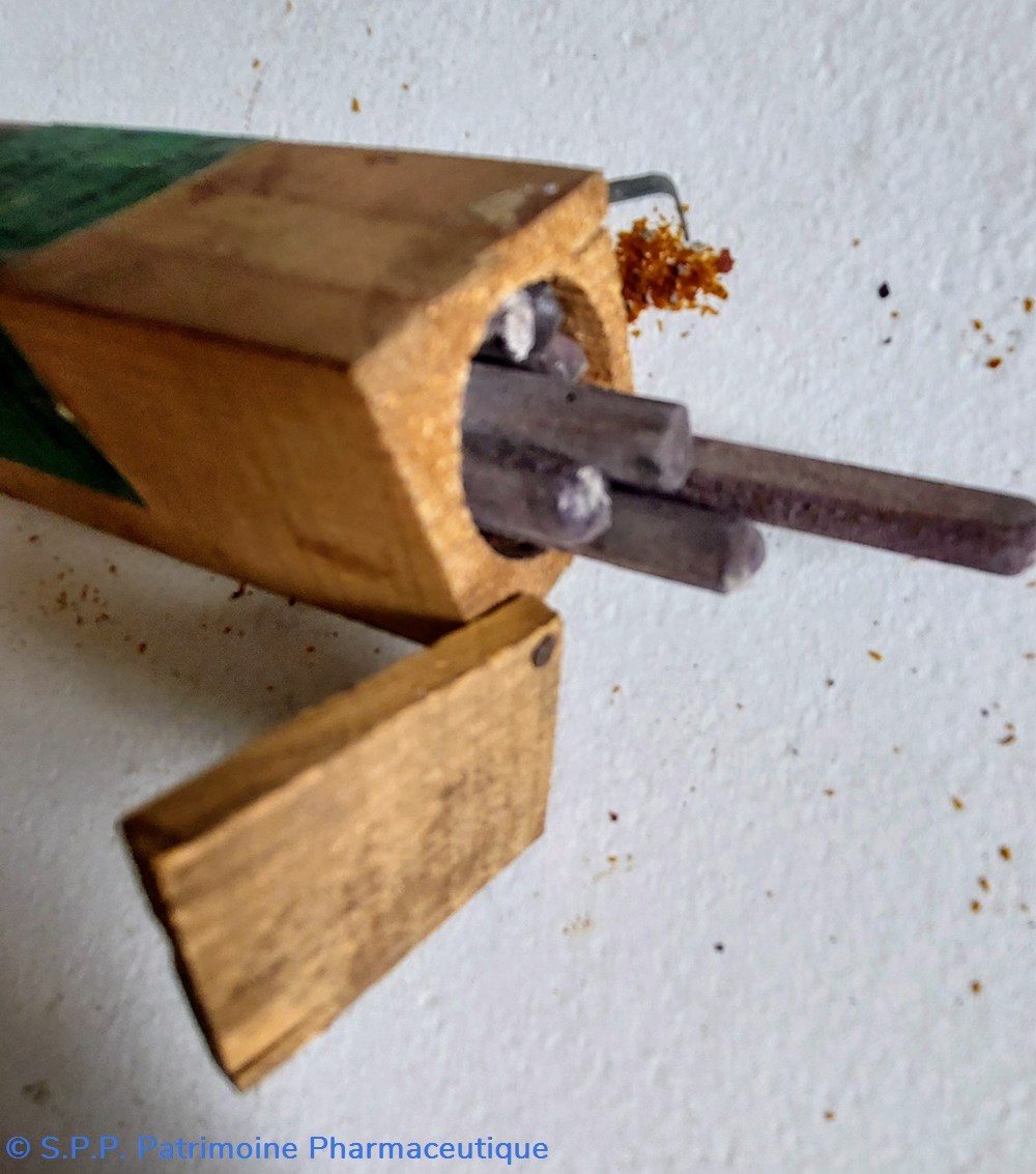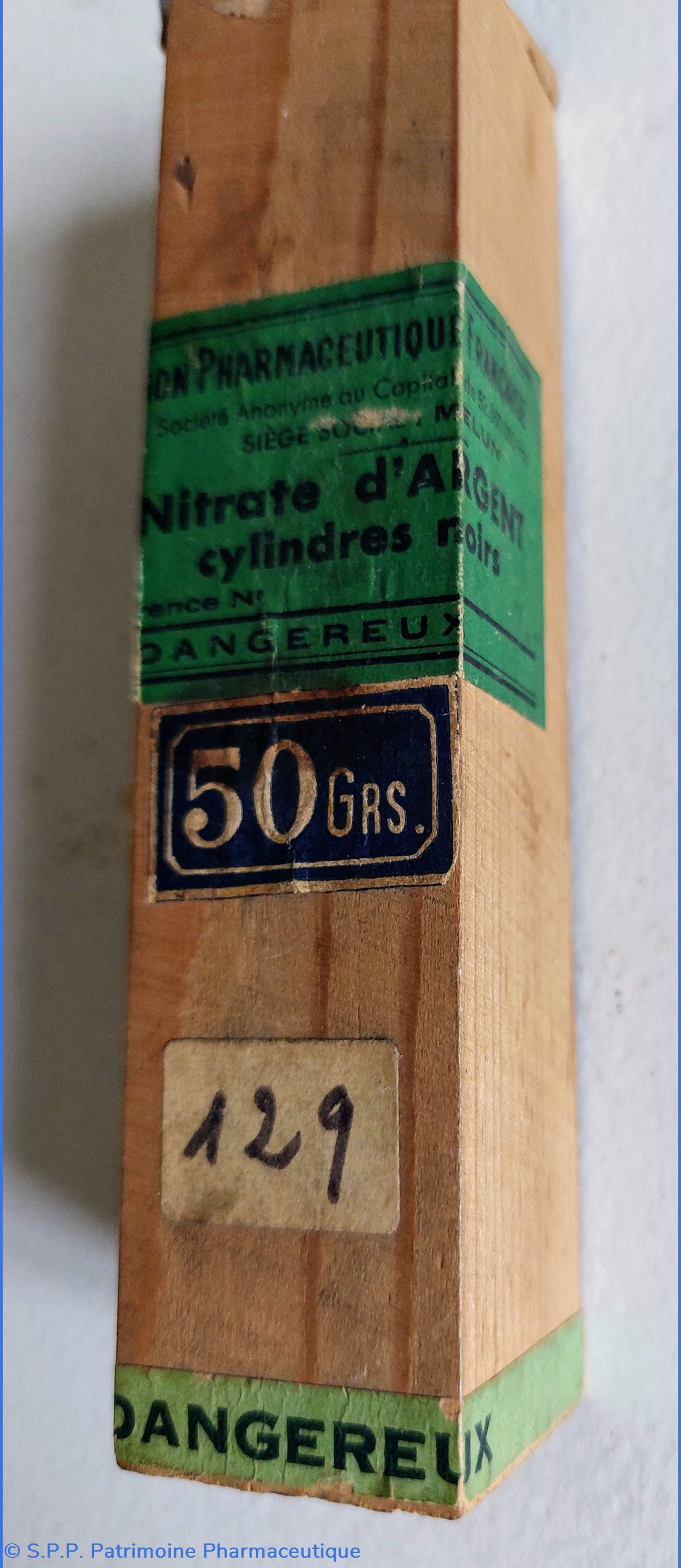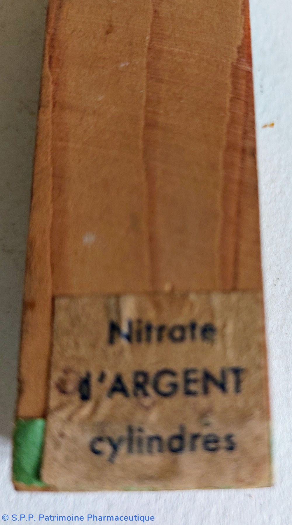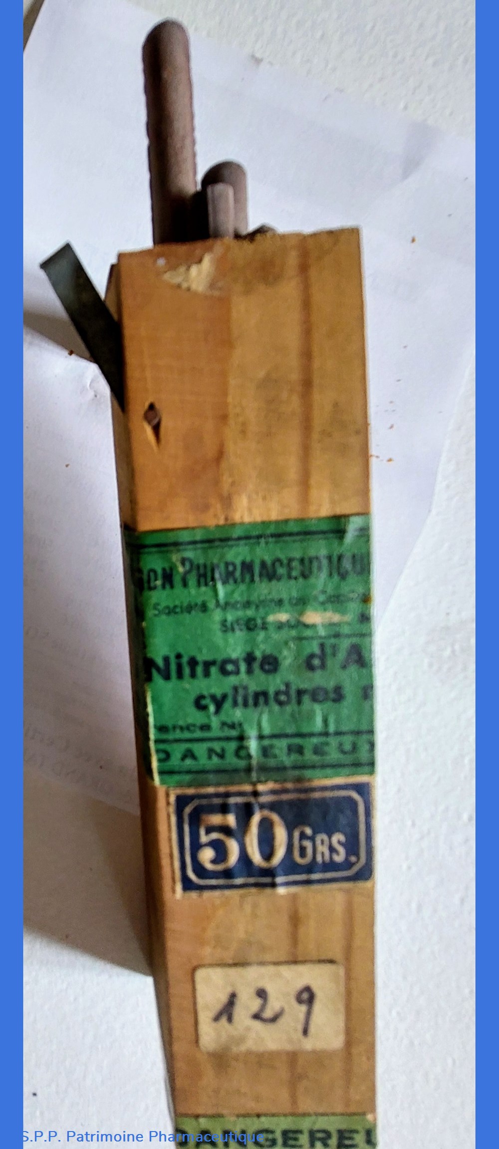 Boîte en bois parallélépipèdique H12 cm et base 3*3 cm contenant des cylindres de nitrates d'argent 50 GRS. Les cylindres ( fragiles) ont la forme de bâtonnets ou crayons de couleur grise mesurant environ 8 cm