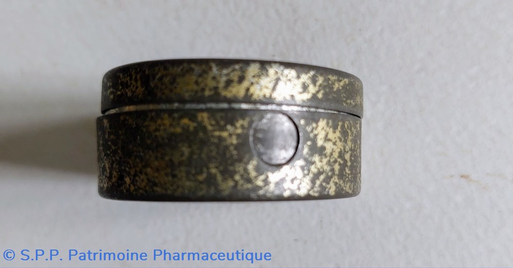 Petite boîte métallique ( de poche) Diamètre 4cm hauteur 2 cm ayant contenu des grains ou pastilles de CACHOU