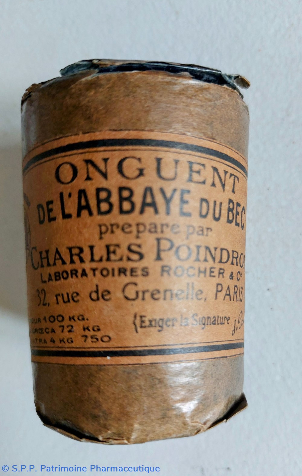Pot métallique cylindrique diamètre 5cm hauteur 7 cm dans son conditionnement d'origine. Contenant L'ONGUENT DE L'ABBAYE DU BEC ( Bec Hellouin) ou Médicament du Roi. .