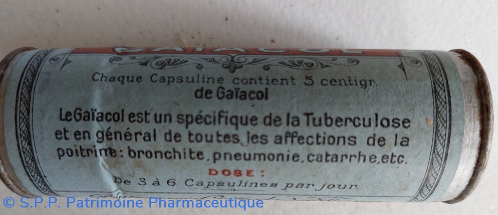 Chaque capsuline contient 5 cg de GAÏACOL Spécifique de la tuberculose et affections de la poitrine, bronchites, pneumonies.