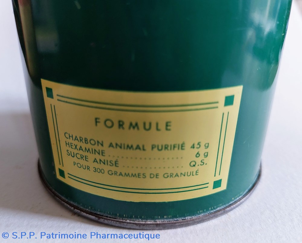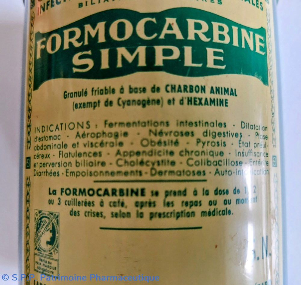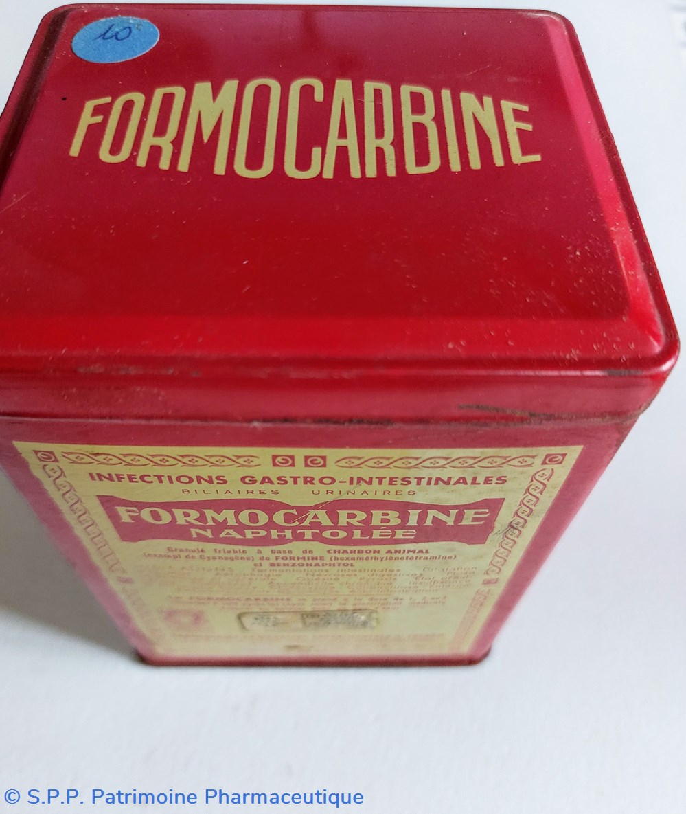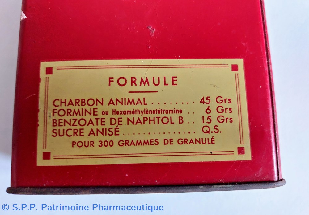 Ayant contenu du FORMOCARBINE NAPHTOLÉE sous forme de granulés à base de charbon animal pour infections gastro intestinales biliaires et urinales.
