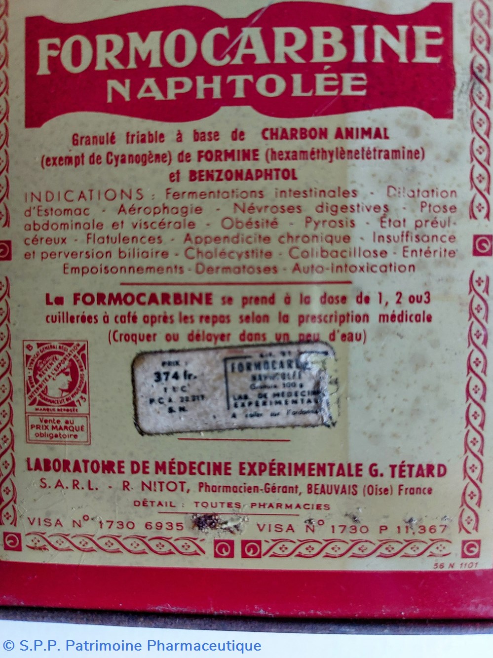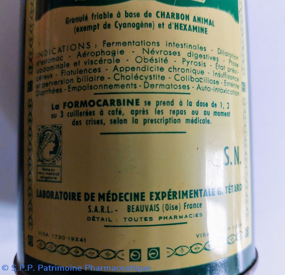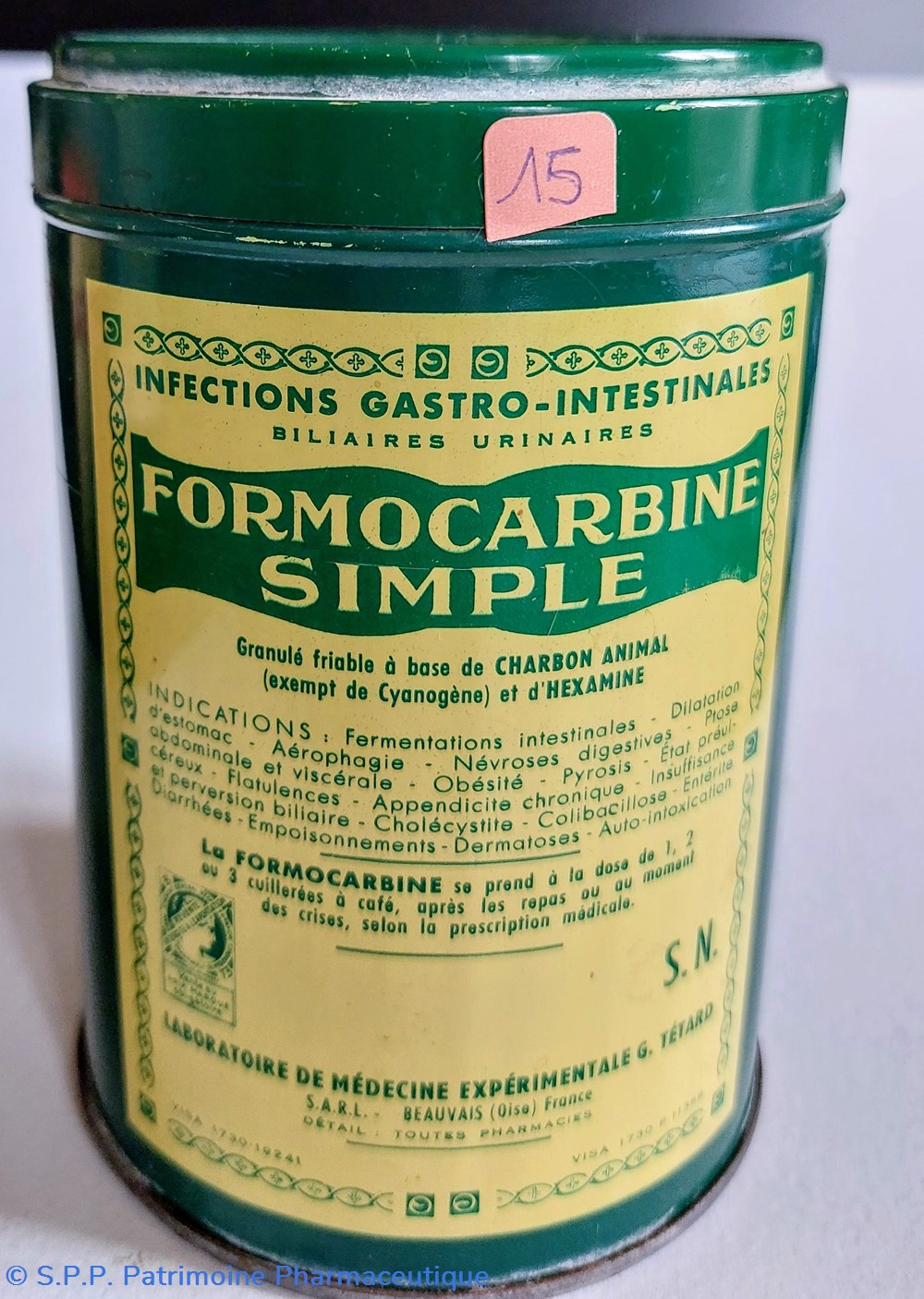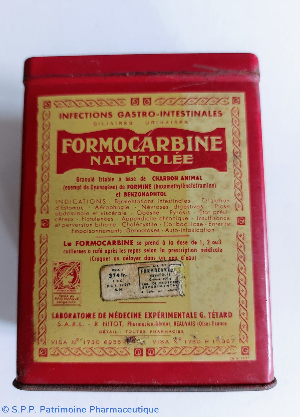 Ayant contenu du FORMOCARBINE NAPHTOLÉE sous forme de granulés à base de charbon animal pour infections gastro intestinales biliaires et urinales.