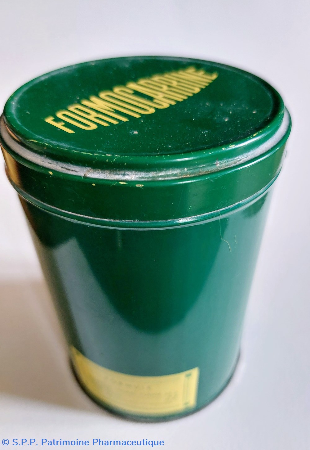 Boîte cylindrique vide de couleur verte Hauteur 13 cm Diamètre 8,5cm. Ayant contenu 300 grs de FORMOCARBINE simple sous forme de granulés friables à base de charbon animal