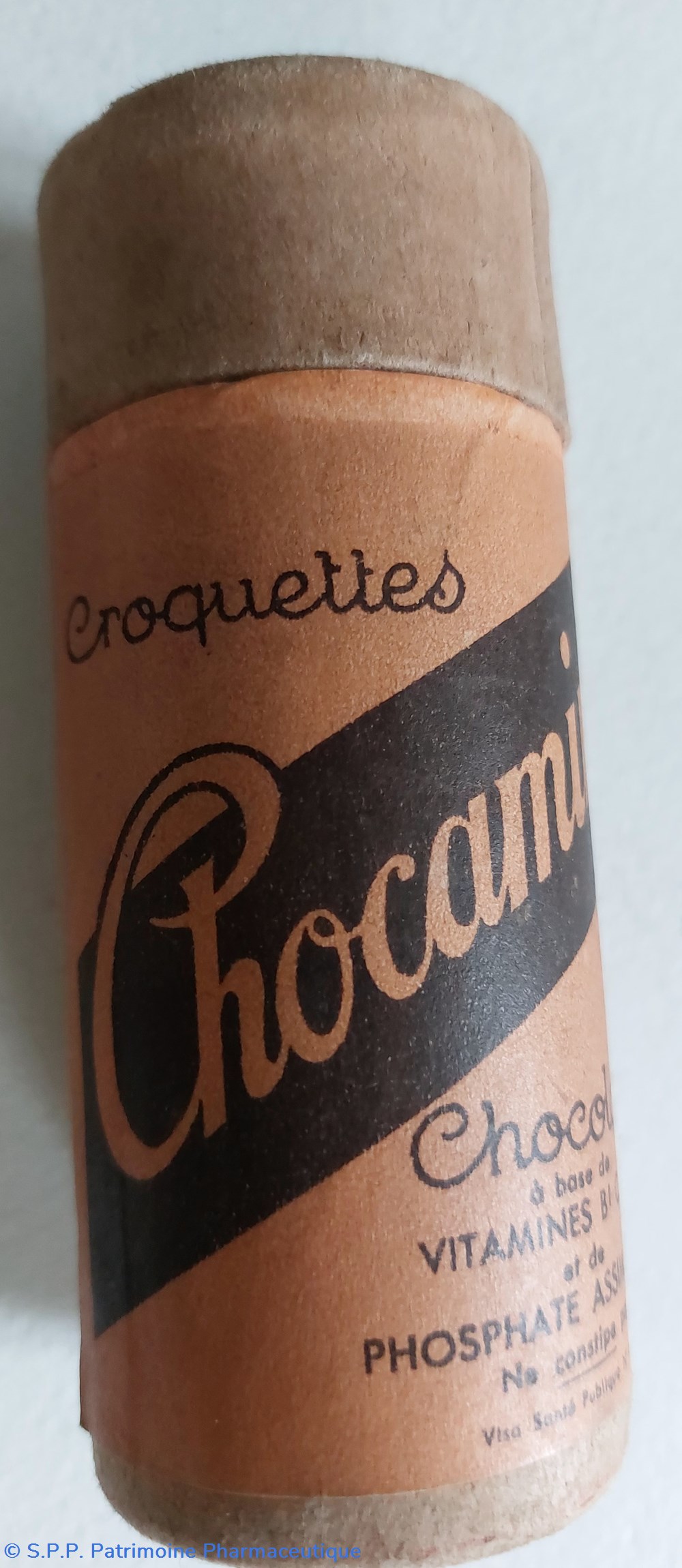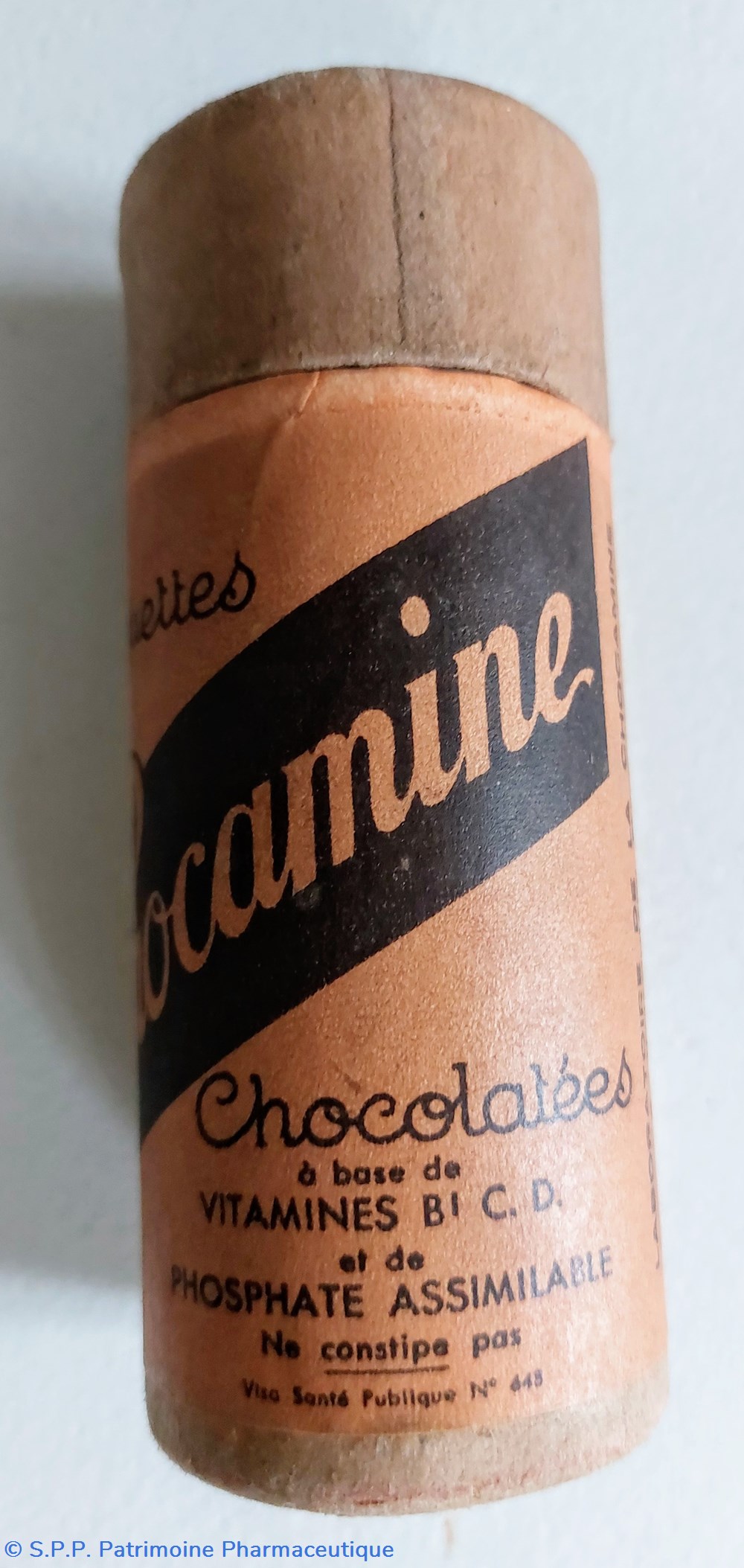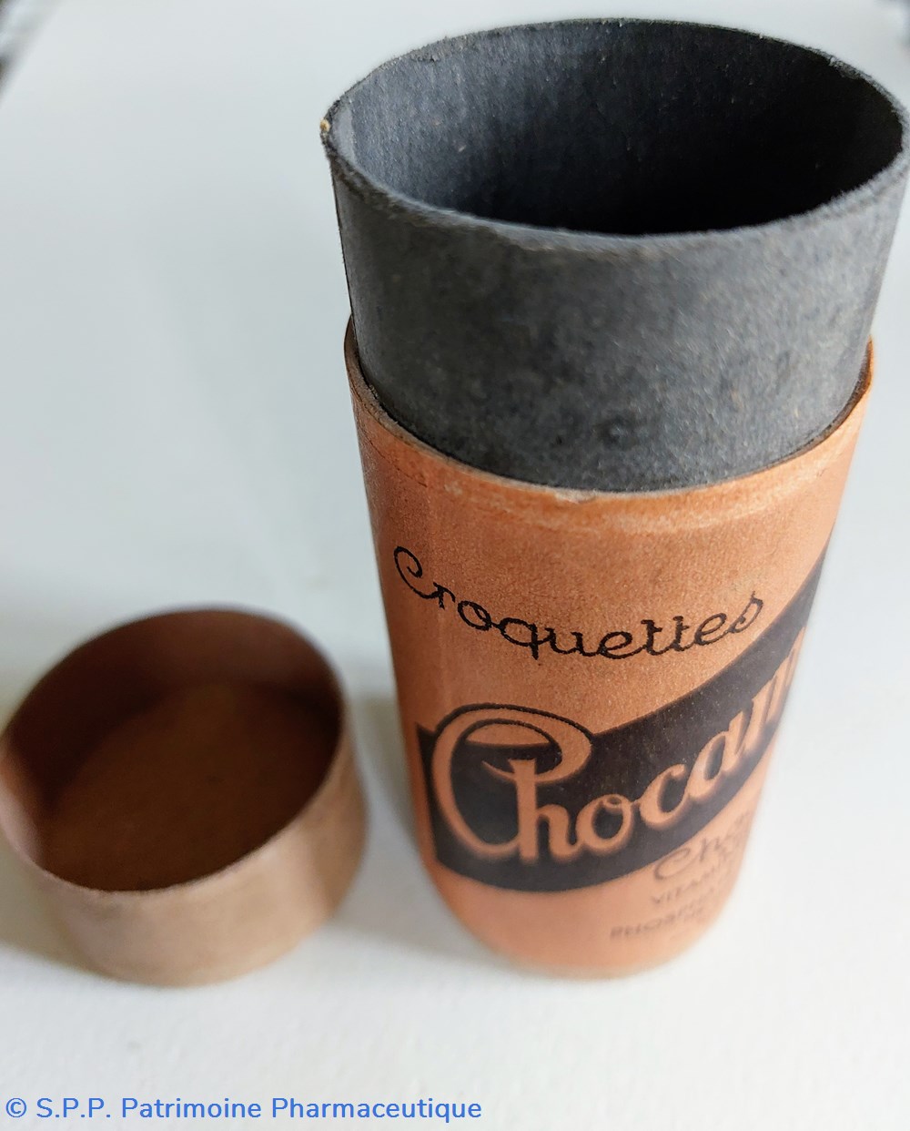 Tube carton vide h 11 cm Diamètre 4,5 cm ayant contenu des croquettes chocolatées à base de vitamines B1, C et D. et phosphore assimilable. Étui de 10 croquettes.